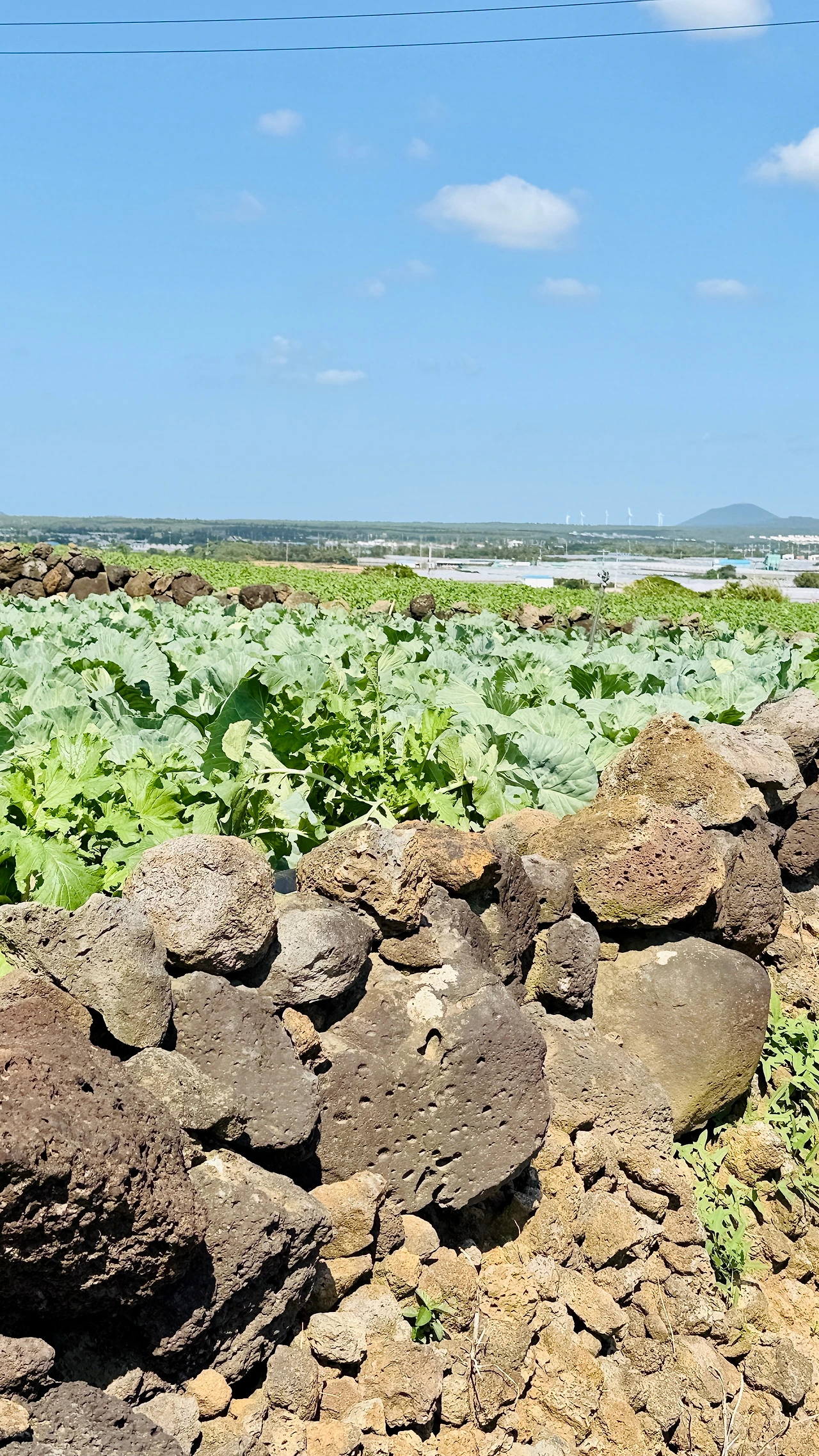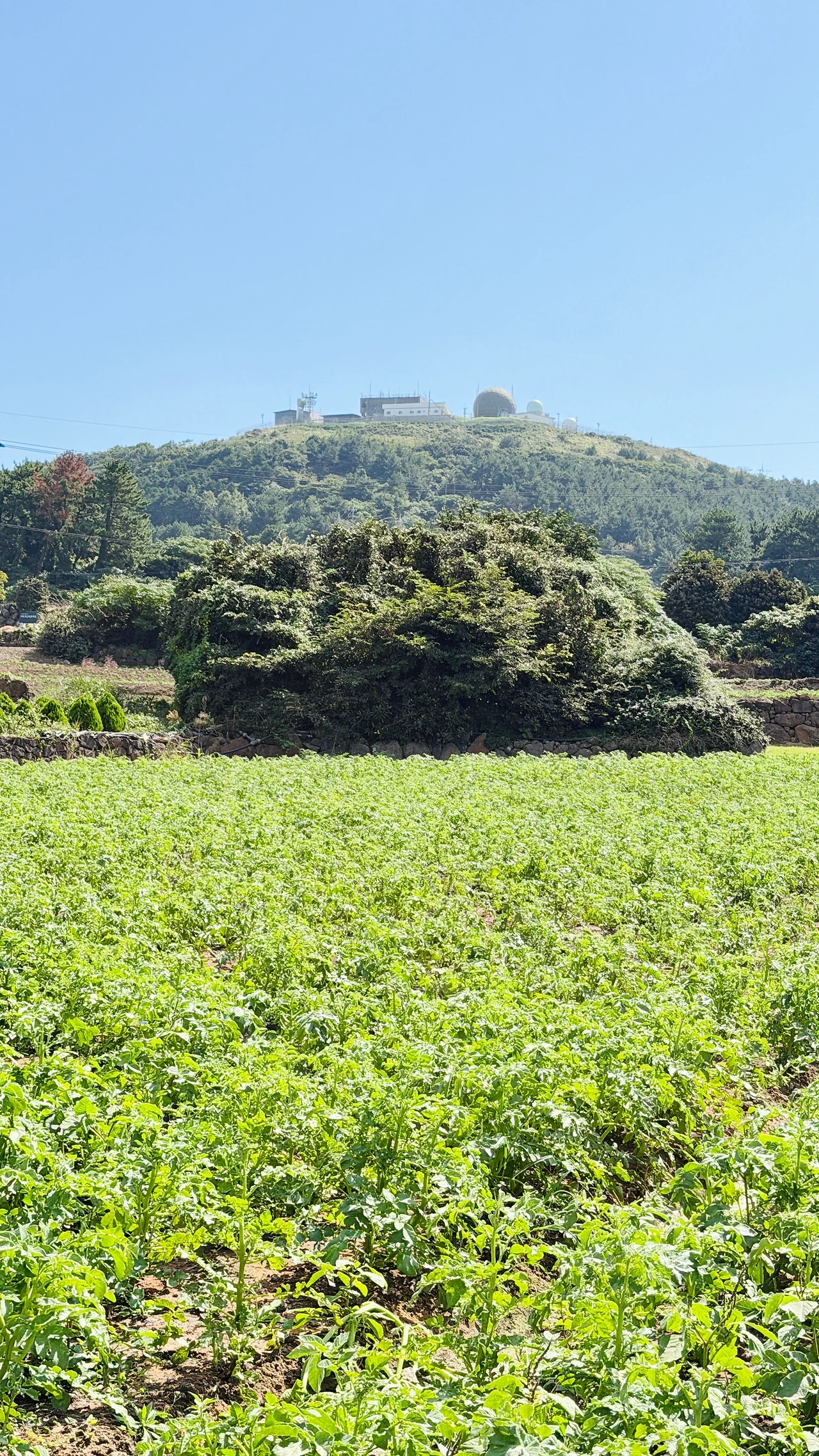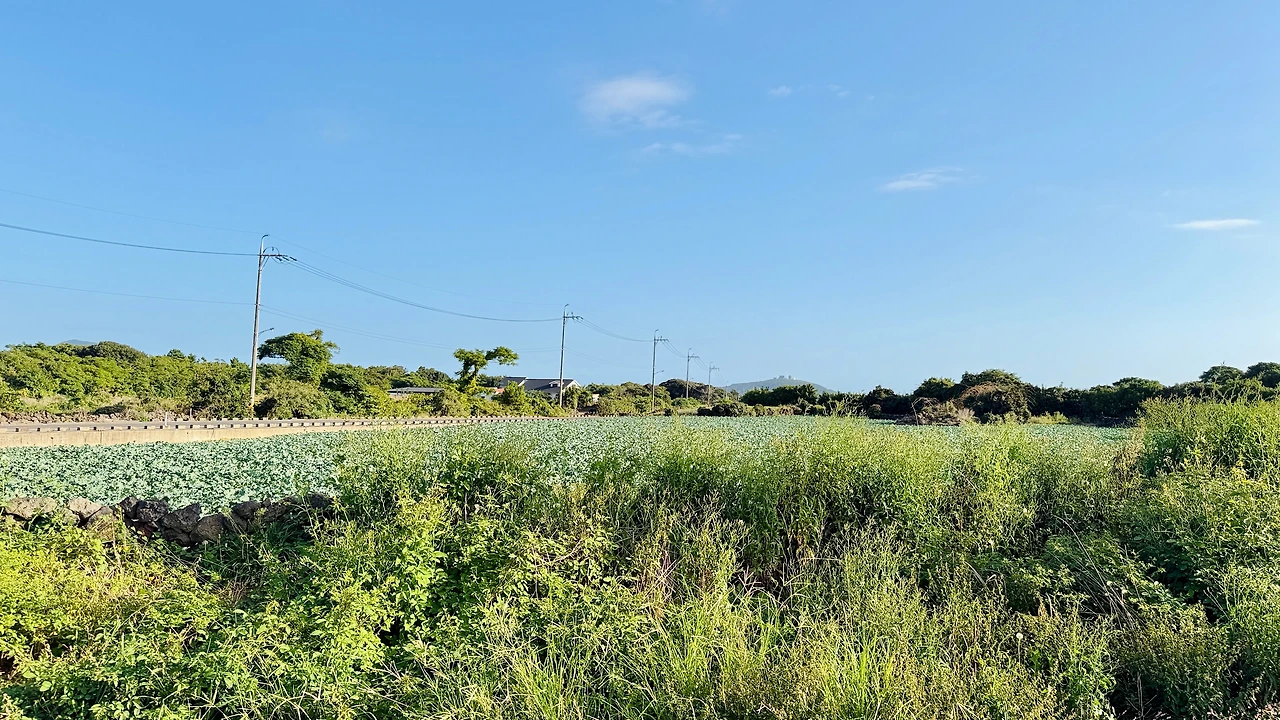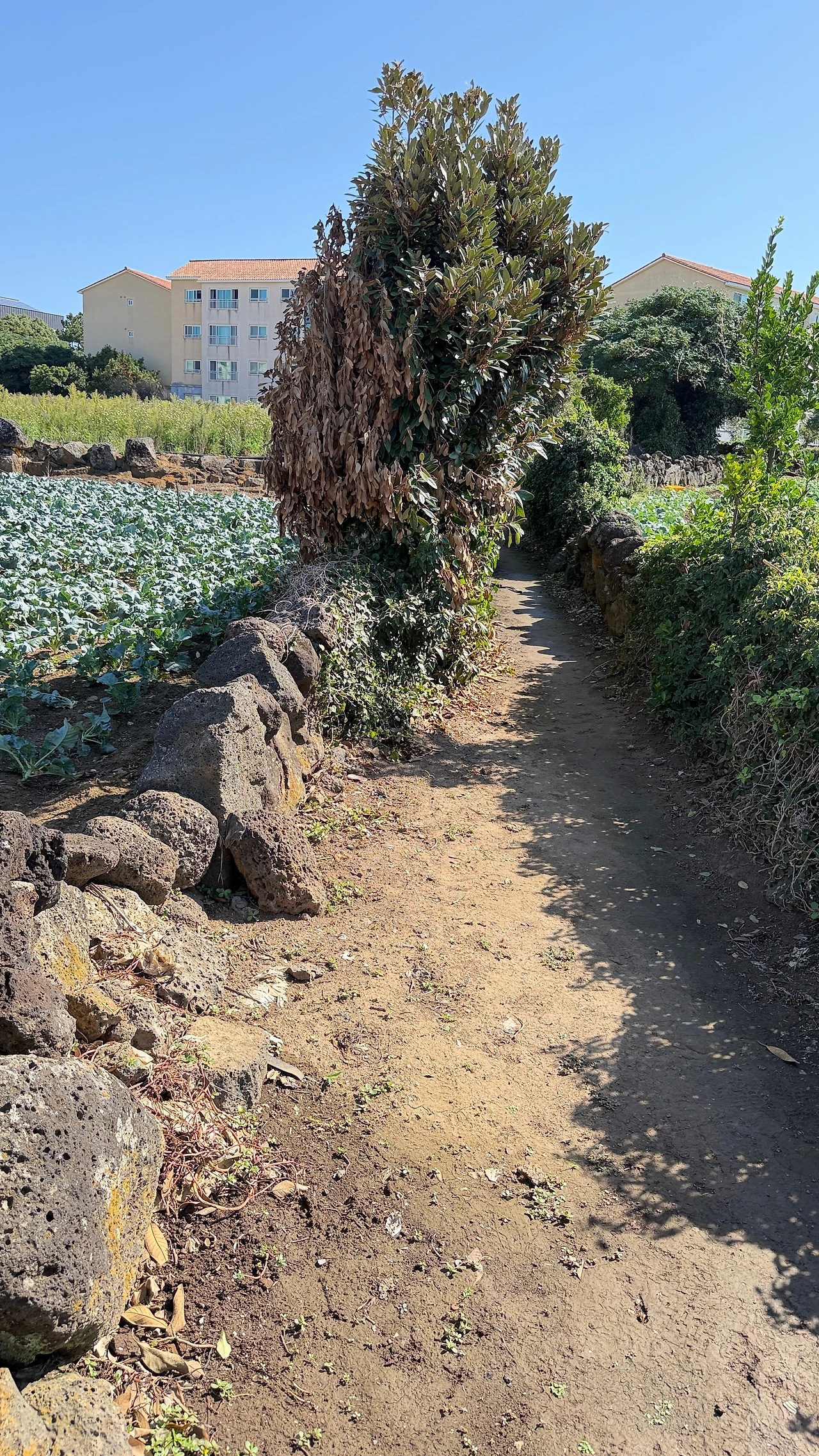 왼쪽에 보이는 덩굴은 참외 덩굴인데 지금부터 시작할리는 없고 왜 심어져 있는지 모르겠네요. 중간에 있는 태양열전기패널도 여기 제주를 비켜나가지 못하네요. 제주에도 밭농사 대신에 전기농사가 서서히 시작되려는 모양입니다. 오른쪽 채소는 무입니다. 다른 코스에서는 이제 씨를 뿌려서 스프링클러로 싹을 틔워서 키우는 수준이었는데 여기는 생장속도가 김장 시즈보다 빨리 출하할 수 있는 정도로 다마가 굵네요.
