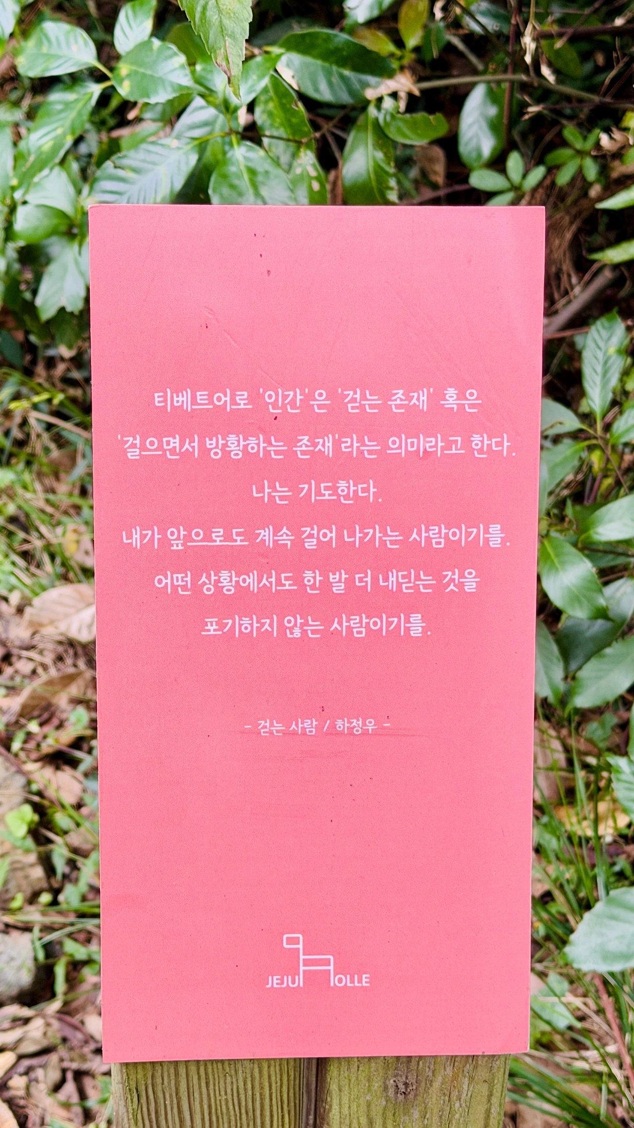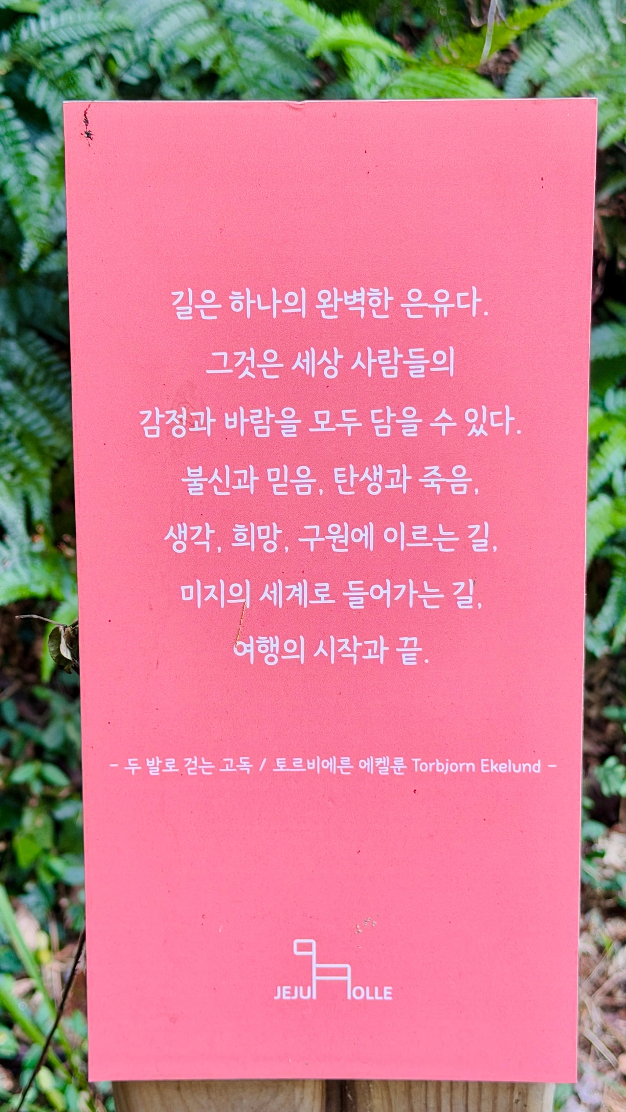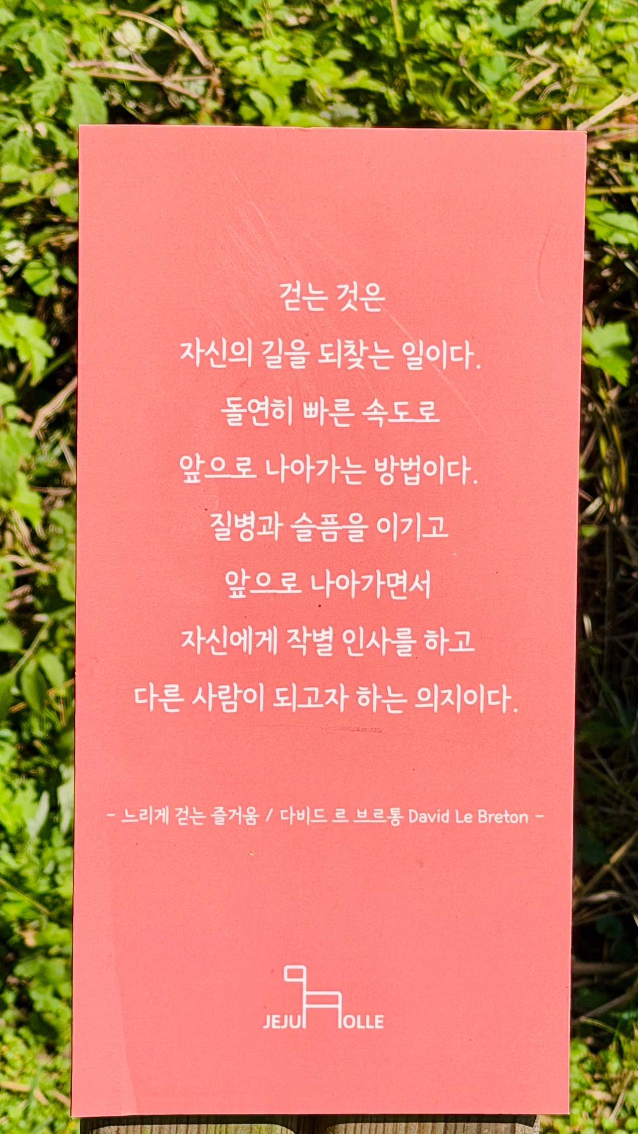걷는다는 것은 자신을 찾는 일이고 앞으로 나아가는 방법이라는 문구가 확 들어옵니다. 올레 길을 걷다 보면 이런 명문들이 몇 군데 있습니다. 걷는 의미를 더욱 확고하게 만들어 줍니다. '질병과 슬픔을 이기고 앞으로 나아가면서 자신에게 작별인사를 하고 다른 사람이 되고자 하는 의지이다.'