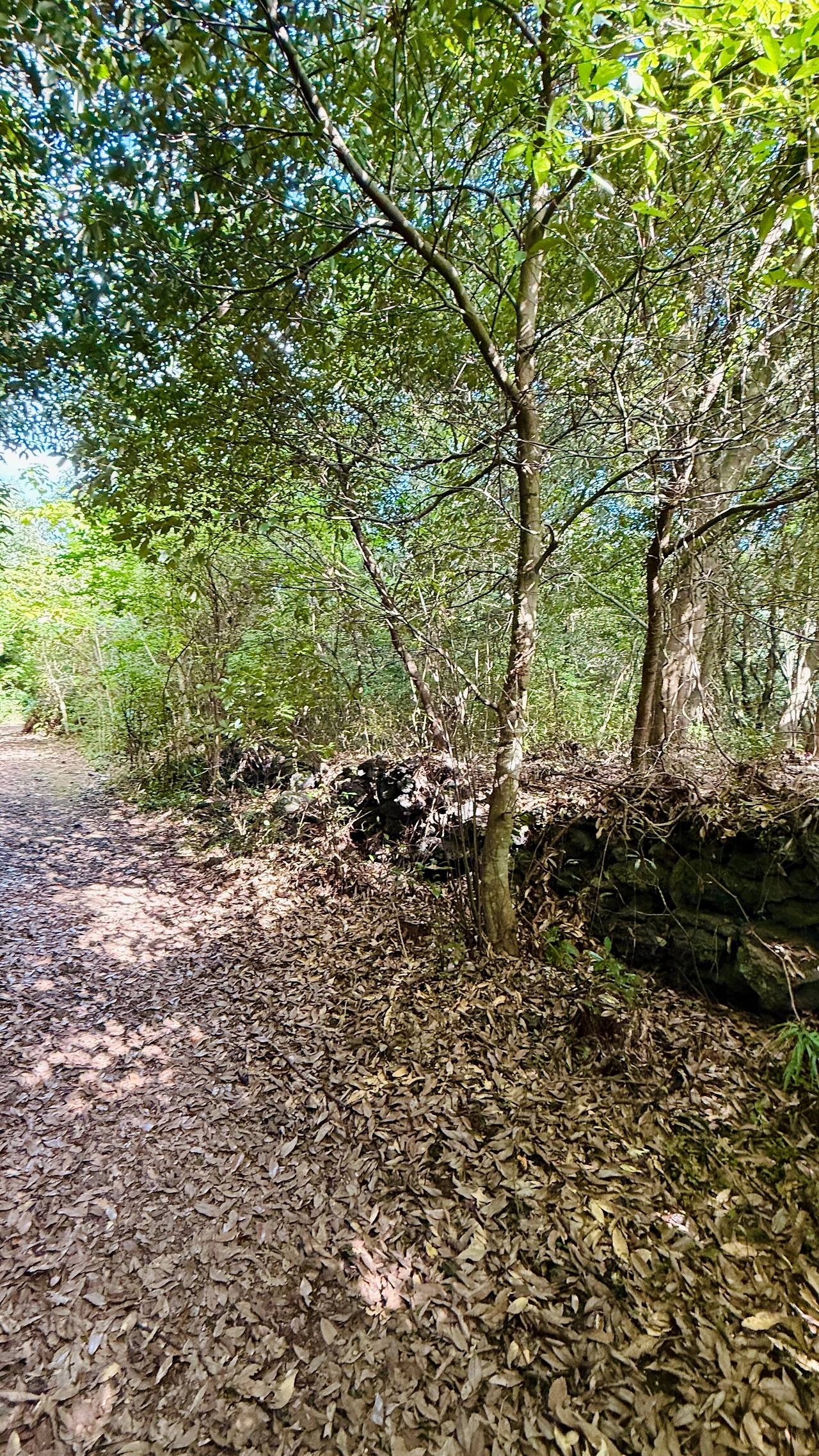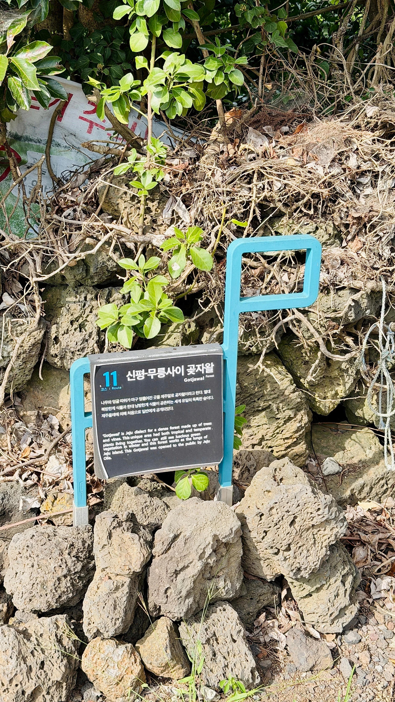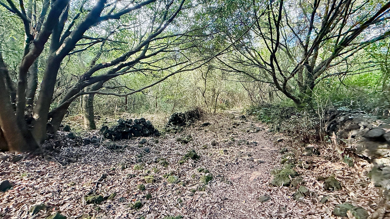 곶자왈 주변의 돌밭을 개간하여 생계를 이어 왔는데 '정개왓'이라는 독특한 지명이 있습니다. 신평-무릉 곶자왈 구간 중간쯤 '정개왓 광장'을 만나게 되는데 정개왓은 정 씨(丁氏, 鄭氏 등) 성을 가진 사람들이 밭을 일구었던 곶자왈 속의 밭이라는 제주어 지명입니다. 정 씨 밭이라는 의미이지요. 이곳은 돌멩이가 많고 농사를 짓기에는 맞이 않아 보였는데 개간하여 일단 농사를 지으면 보온/보습 효과 덕분에 일부 작물이 잘 자라는 특징이 있다고 합니다. 이 척박한 땅에 밭을 일구었던 제주도 사람들이 얼마나 애썼는지를 알 수 있는 곳이며 무수히도 많은 밭의 경계를 나누었던 돌담이 있습니다. 그 돌담 위에 커다란 나무가 여지없지 자리를 차지하고 있고 사람은 이제 사라지고 없고 단지 경계를 나타냈던 돌담 많이 헝클어진 덩굴과 나뭇가지들이 덩하지 있습니다.