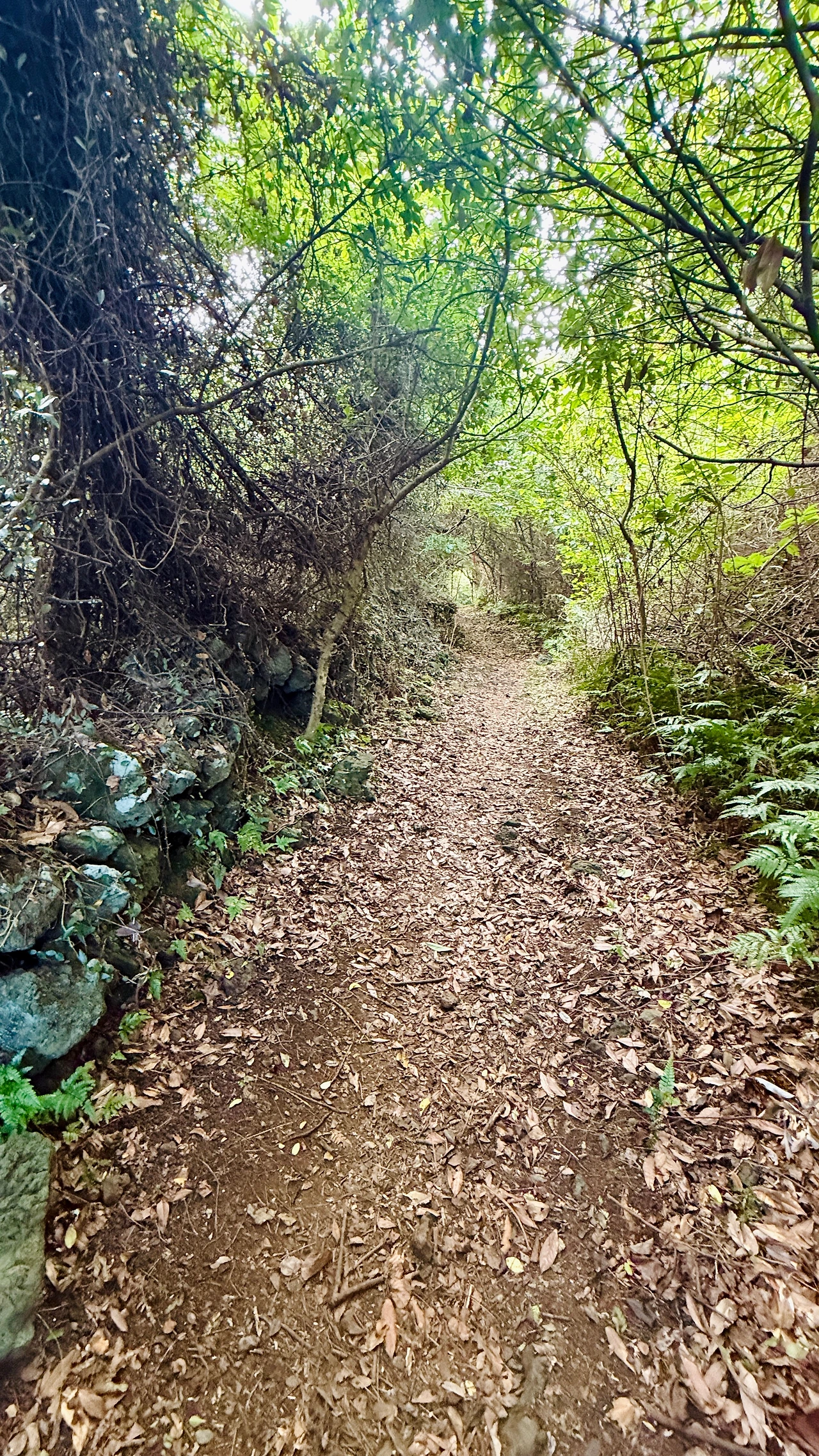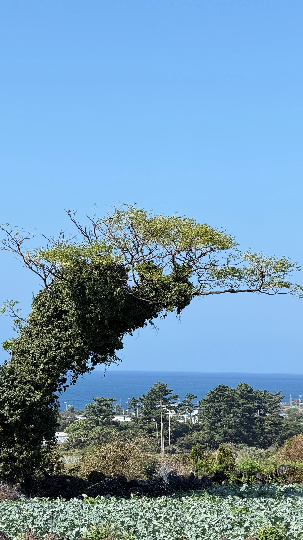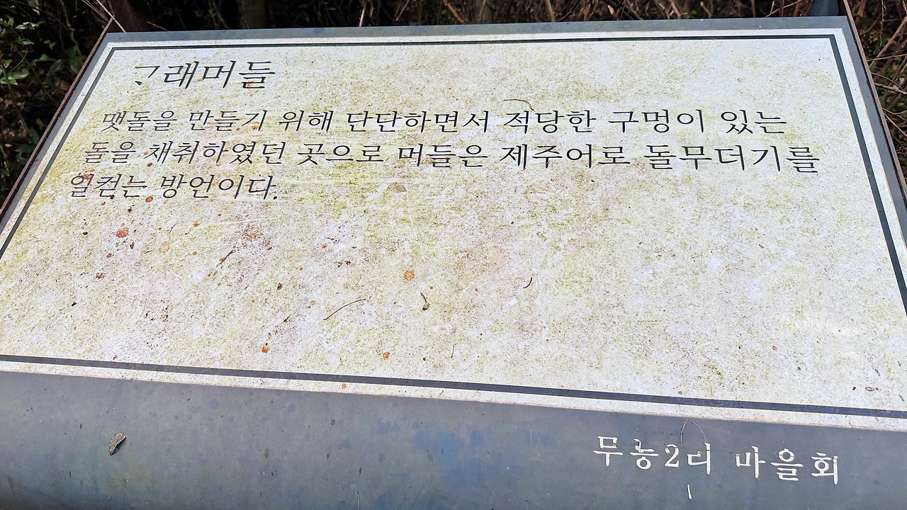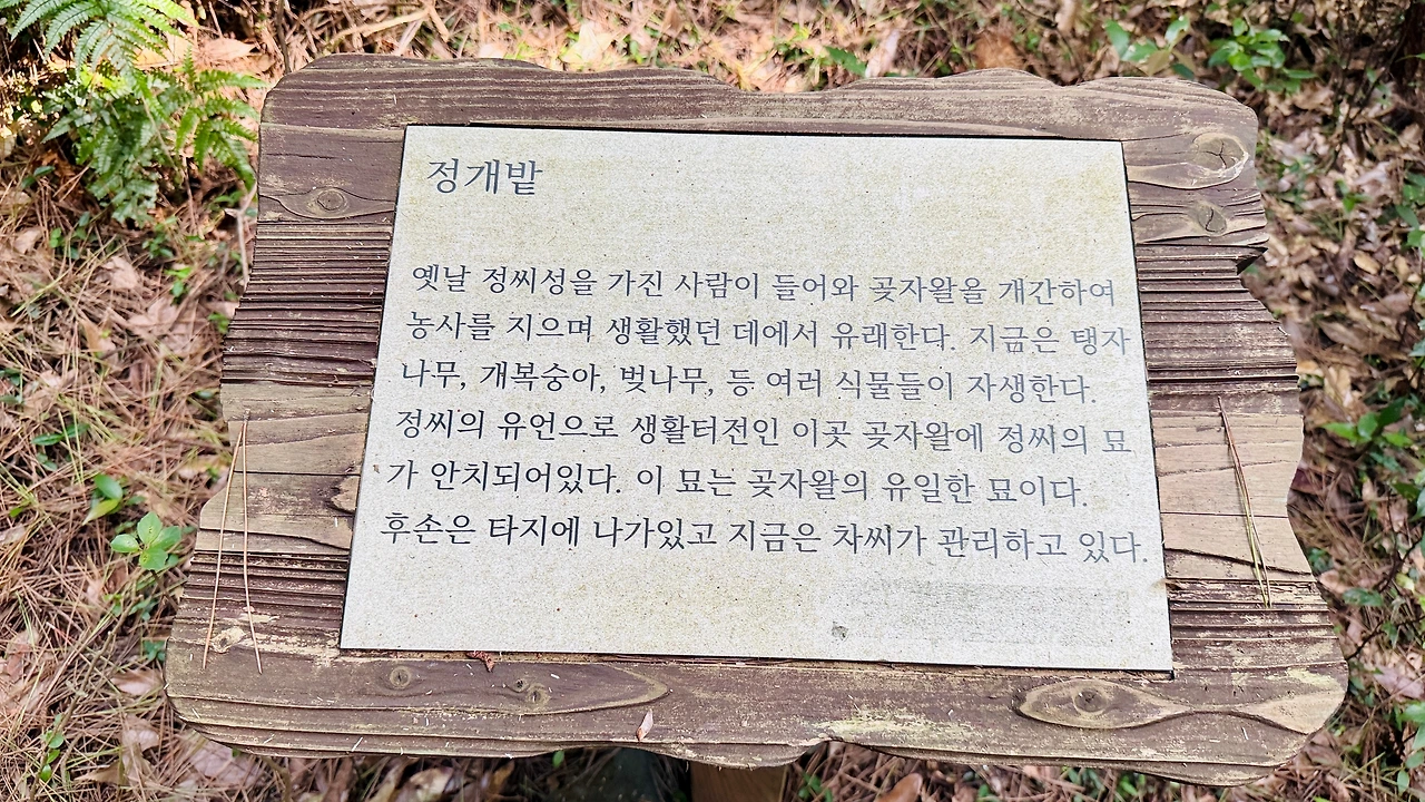 곶자왈 주변의 돌밭을 개간하여 생계를 이어 왔는데 '정개왓'이라는 독특한 지명이 있습니다. 신평-무릉 곶자왈 구간 중간쯤 '정개왓 광장'을 만나게 되는데 정개왓은 정 씨(丁氏, 鄭氏 등) 성을 가진 사람들이 밭을 일구었던 곶자왈 속의 밭이라는 제주어 지명입니다. 정 씨 밭이라는 의미이지요. 이곳은 돌멩이가 많고 농사를 짓기에는 맞이 않아 보였는데 개간하여 일단 농사를 지으면 보온/보습 효과 덕분에 일부 작물이 잘 자라는 특징이 있다고 합니다. 이 척박한 땅에 밭을 일구었던 제주도 사람들이 얼마나 애썼는지를 알 수 있는 곳이며 무수히도 많은 밭의 경계를 나누었던 돌담이 있습니다. 그 돌담 위에 커다란 나무가 여지없지 자리를 차지하고 있고 사람은 이제 사라지고 없고 단지 경계를 나타냈던 돌담 많이 헝클어진 덩굴과 나뭇가지들이 덩하지 있습니다.