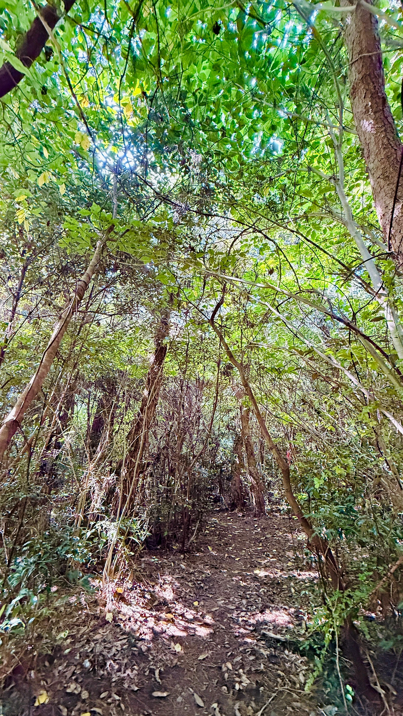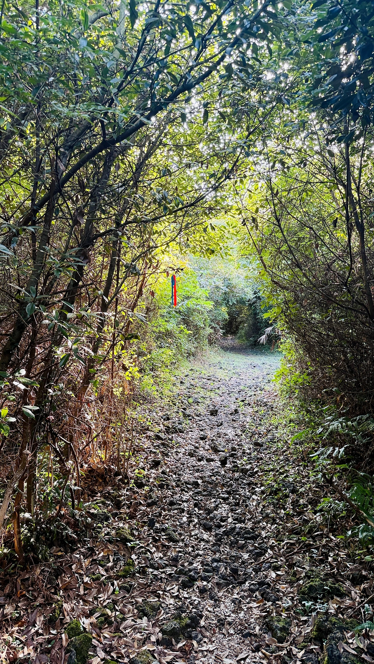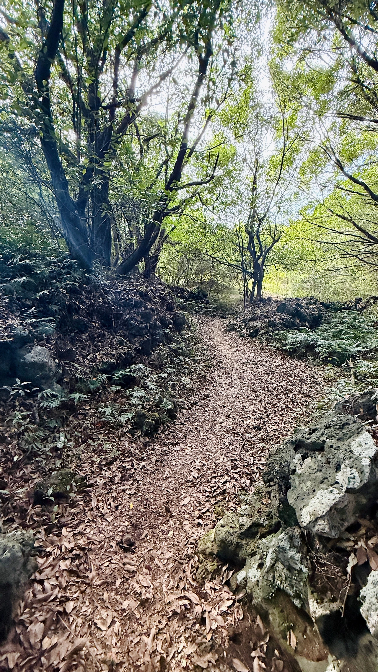 신평곶자왈시작점입니다. 종점은 무릉 곶자왈입니다. 비밀의 숲이라고 불리기도 합니다. 왜 그런지 가보면 알게 됩니다. 곶자왈은 제주 방언으로 나무와 덩굴 따위가 마구 헝클어진 숲을 뜻한다 합니다. 물론 용암이 흐르다 굳은 독특한 지형(용암지대) 위에 형성된 숲입니다. 그래서 물이 잘 스며들며 독특한 생태계를 이루고 북방계 식물과 남방계 식물이 공존하는 희귀한 곳입니다. 이 곶자왈 구간은 제주 올레길 개척을 통해 일반인에게 처음 공개된 곳으로 길을 걷는 사람들에게 또 다른 감동과 평온함을 선사합니다. 이 길이 아주 길기 때문에 마실 것을 충분히 준비해서 걸어야 합니다.
