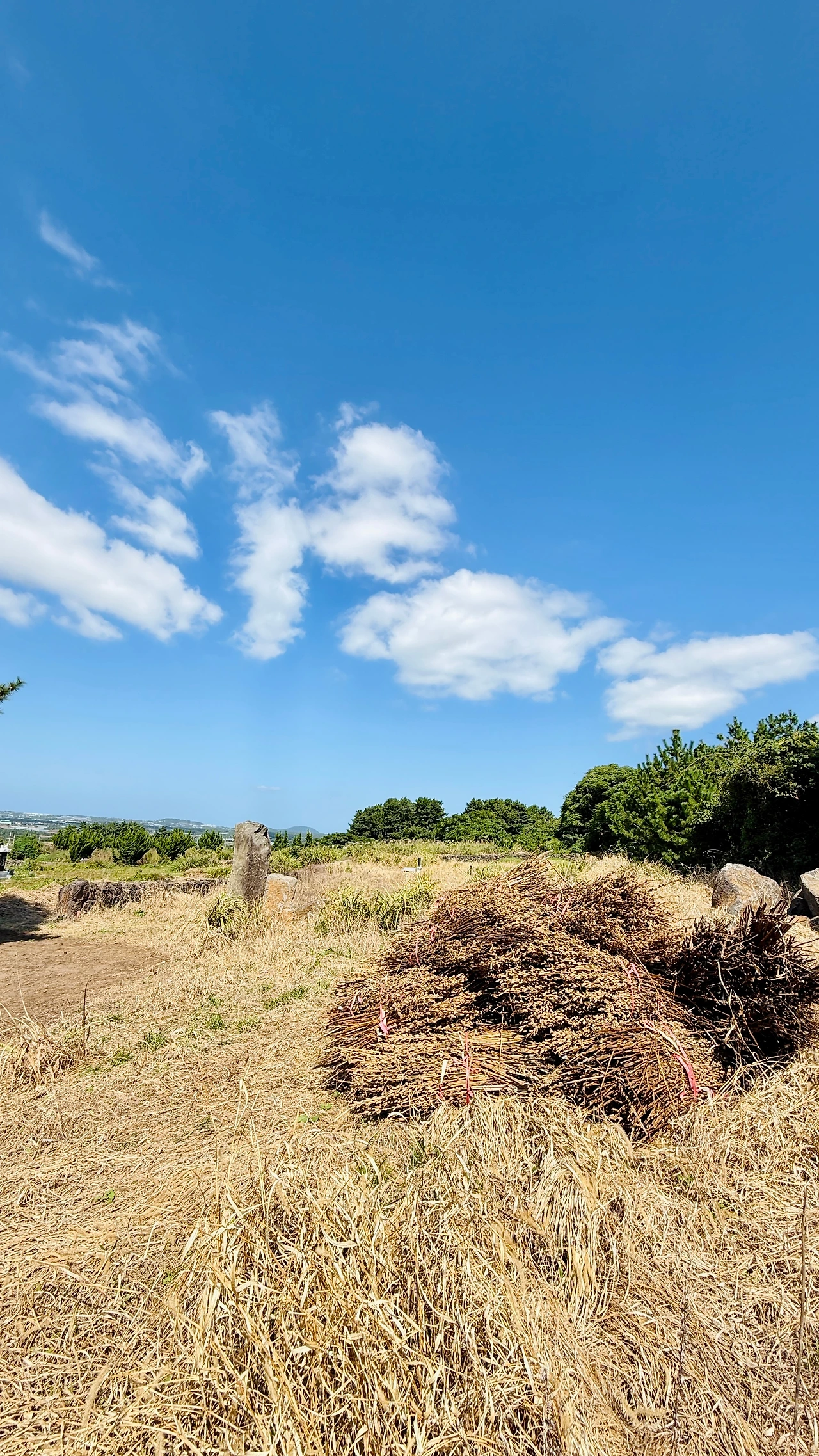 메밀꽃이 피어 있습니다. 아까 대정여고 방향의 뒤편이 여기입니다. 둘레 언덕을 내려오다 보면 깨대들이 깨가 털린 후에 쌓아져 있네요. 그 깨들은 제주의 맛있는 나물 반찬에 들어 가 맛을 잘 내고 있겠지요.