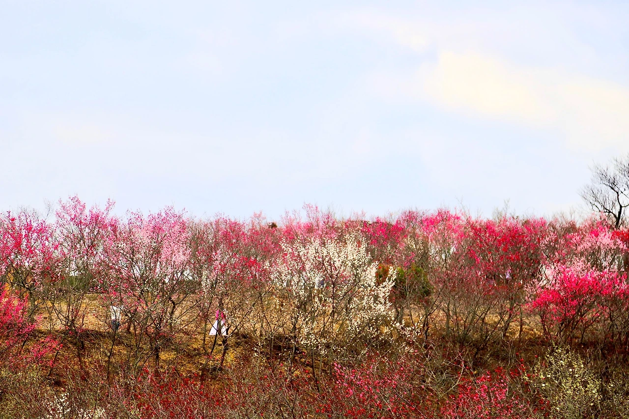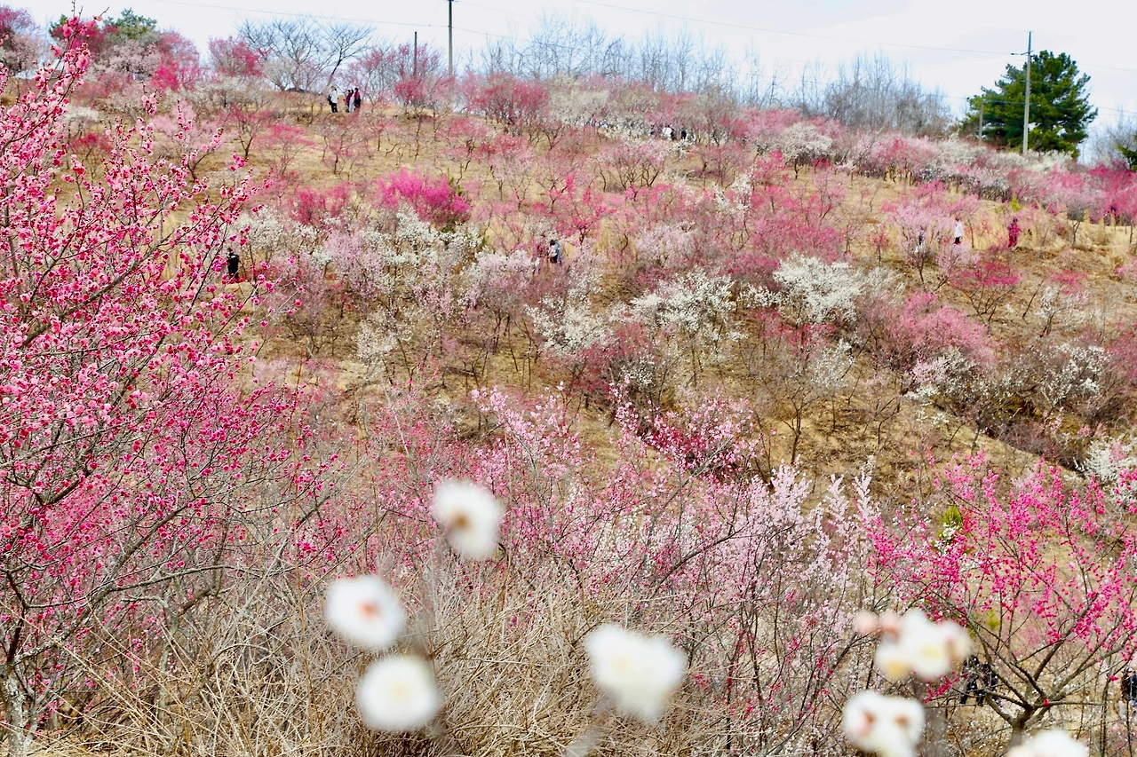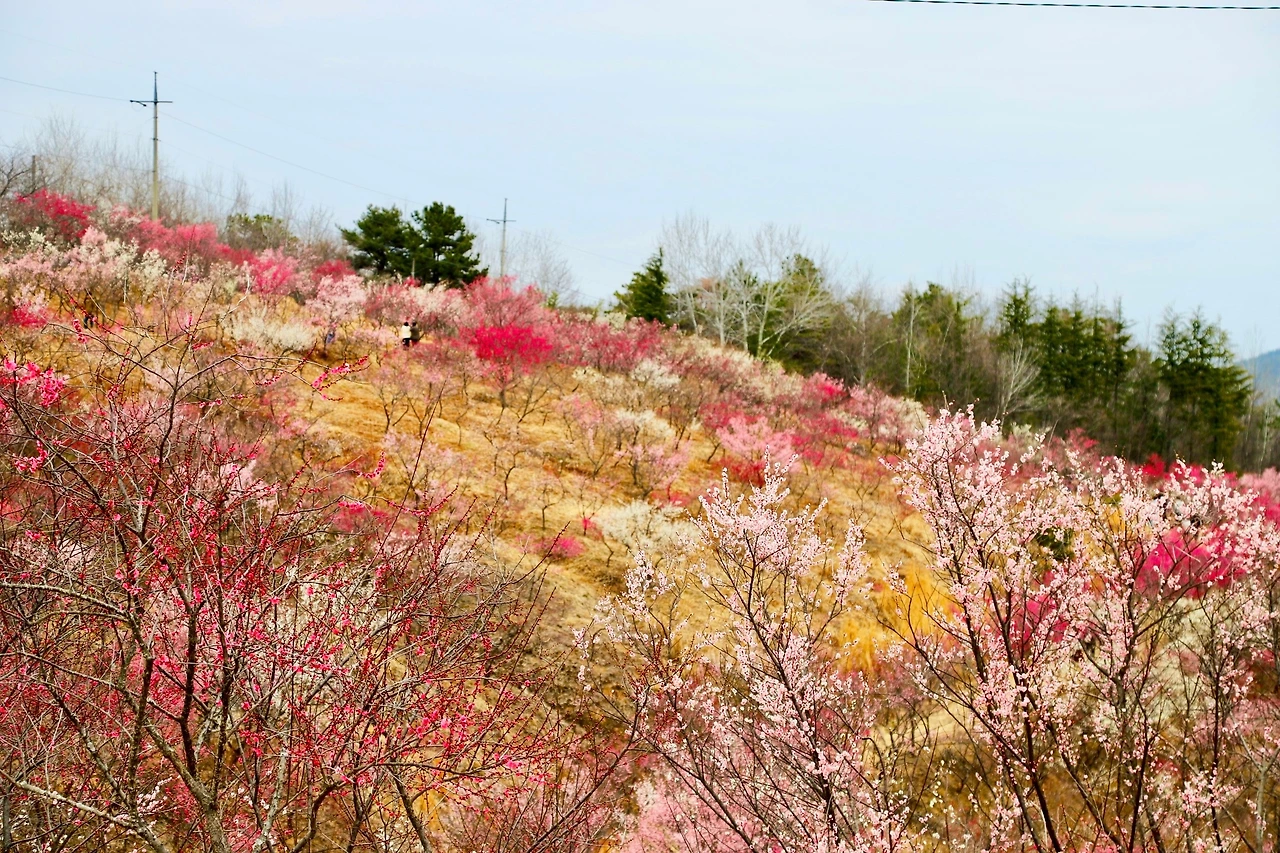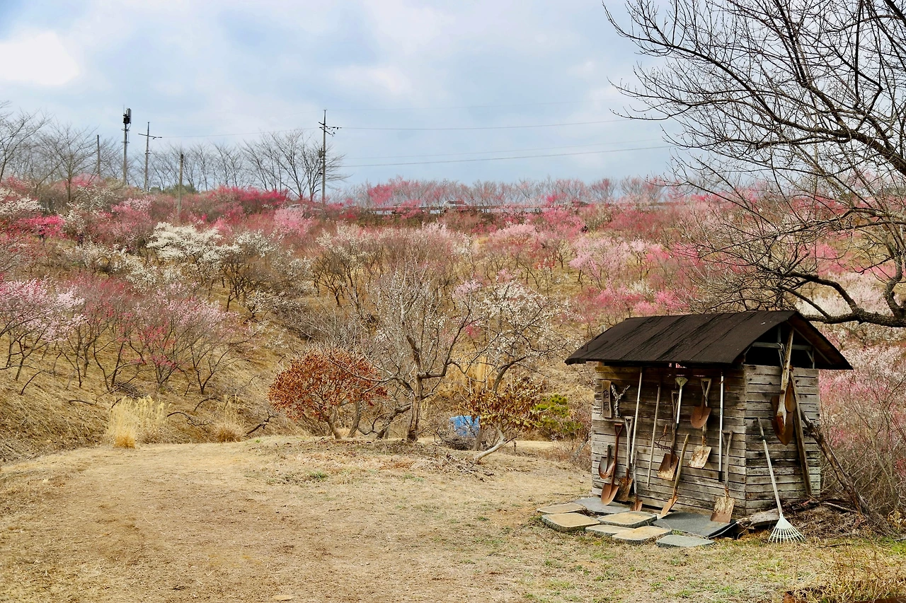 아래에서 저기 언덕을 바라볼 때 사뭇 복사꽃처럼 보인다. 복사꽃은 온통 분홍이지만 흰색과 아이보리의 적절한 조화의 복사꽃은 없다. 게다가 완전한 홍매화도 아닌 것이 분홍의 매화와 새빨간 매화가 다투기도 한다.