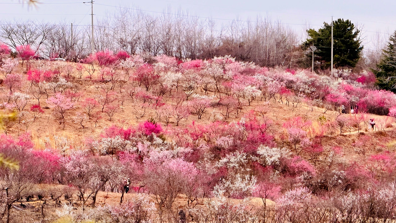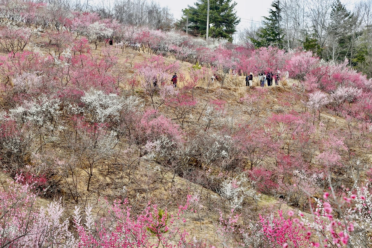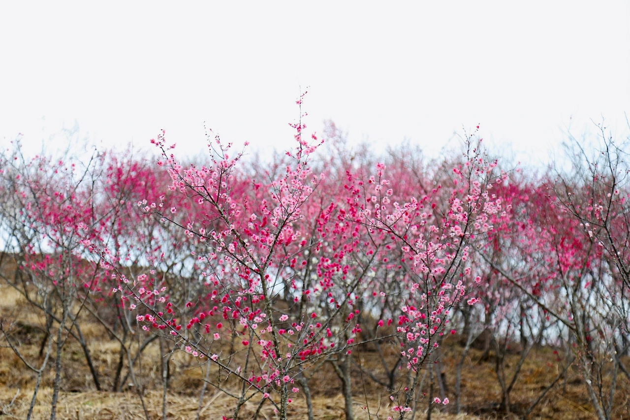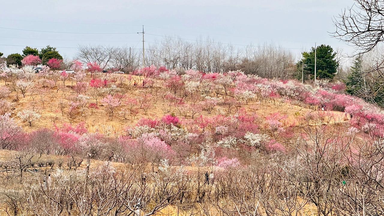 아래에서 저기 언덕을 바라볼 때 사뭇 복사꽃처럼 보인다. 복사꽃은 온통 분홍이지만 흰색과 아이보리의 적절한 조화의 복사꽃은 없다. 게다가 완전한 홍매화도 아닌 것이 분홍의 매화와 새빨간 매화가 다투기도 한다.