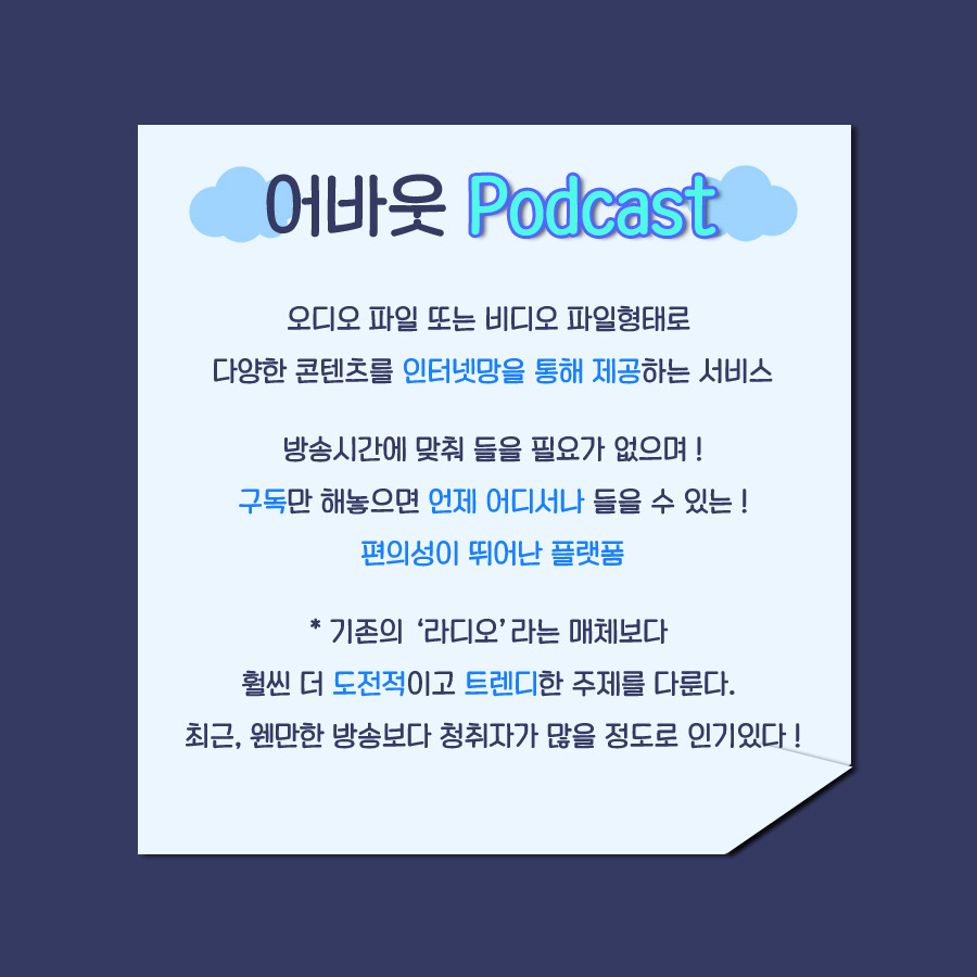 시간이 흐르고 팟캐스트라는 플랫폼이 널리 정착된 현재. 우리는 지하철 타고 학교 갈 때, 차 타고 퇴근할 때, 집에서 혼자 밥 먹을 때 등