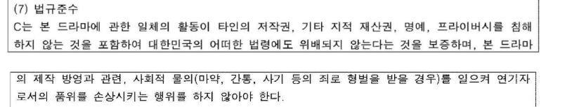 아래와 같은 법규 준수 의무가 있고 이를 위반할 경우 연기자는 소속사와 함께 연대 손해배상 책임이 지게 하는 것으로 보인다. 아래 조항이 표준 조항 문구인지는 잘 모르겠으나 관련 사건(학창시절 학폭으로 드라마에서 하차한 사례)에서는 가장 핵심 문구였음.