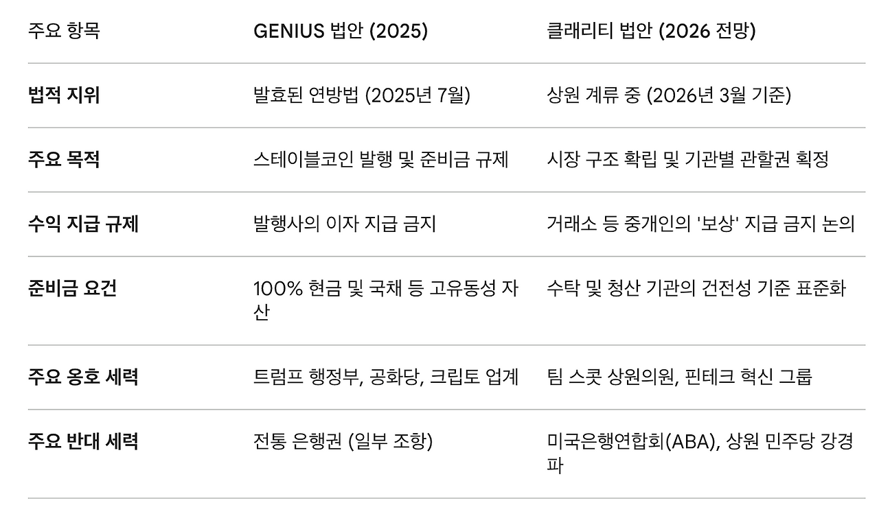 클래리티 법안의 통과 여부는 2026년 미국 디지털 자산 시장의 향방을 결정지을 가장 중요한 변수이다. 현재 법안은 전통 은행권의 강력한 로비와 정치적 이해관계가 얽히며 복합적인 국면에 처해 있다.