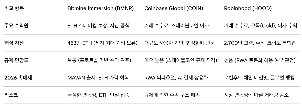 BMNR, COIN, HOOD는 각기 다른 비즈니스 모델을 가지고 있으나, 공통적으로 '온체인 금융'이라는 거대한 흐름 위에 올라타 있다.