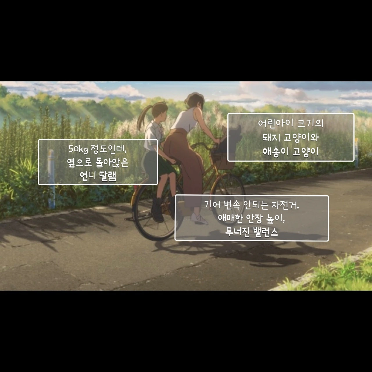 그리고 스즈메 이모를 통해 그 의문을 해결할 수 있었다. 후반에 나온 이모의 20KM 생활차 라이딩을 보며, 스즈메의 피지컬은 모계 유전임이 분명하다는 답을 얻었다. 계속 내면에서 날 괴롭히던 개연성 문제가 속시원하게 해결되는 순간이었다.