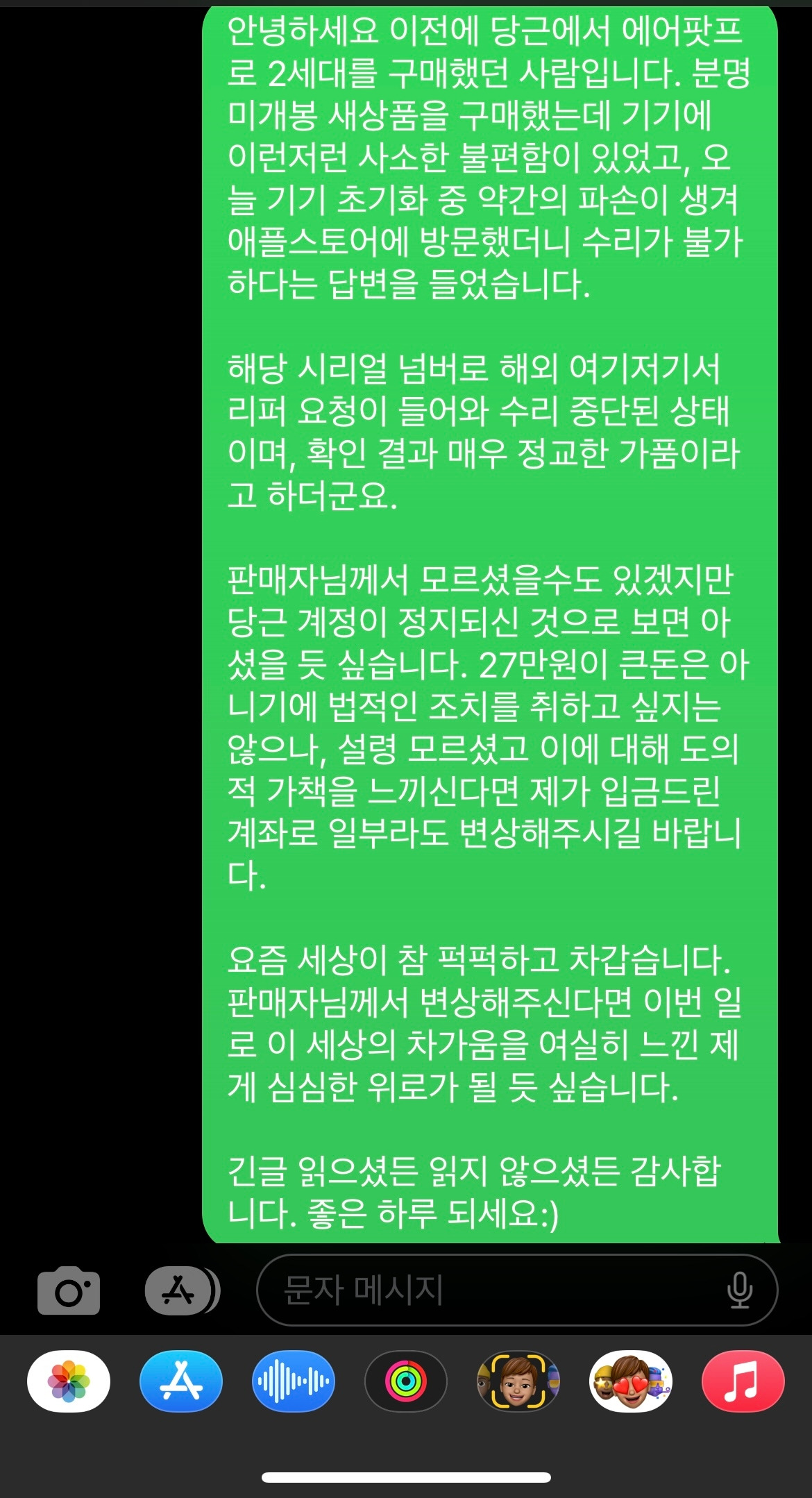 앱등이로서 수많은 씰을 개봉해 왔던 나도 이질감을 느끼지 못했다. 뚜껑을 열자 아이폰과의 연결 추천 인터페이스는 물론, 일련번호, 애케플 보증까지 아무 문제없었다. 역시 믿고 사는 당근 미개봉 새 상품이라고 자위하며 안도했다.