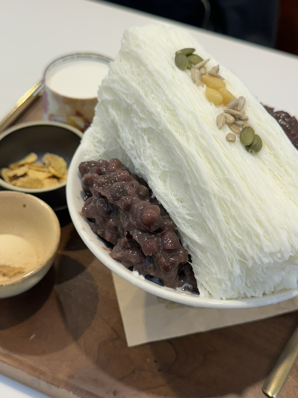 아무 맛도 안나는 의미 없는 장식을 음식 위에 얹는 것을 싫어하나, 이 집 빙수의 가니쉬들은 단순 장식이 아니었다. 잣, 해바라기씨, 콩가루, 그래놀라, 연유는 각각 왜 함께 곁들여먹어야 하는지 그 의미를 정확하게 증명하고 있었다.