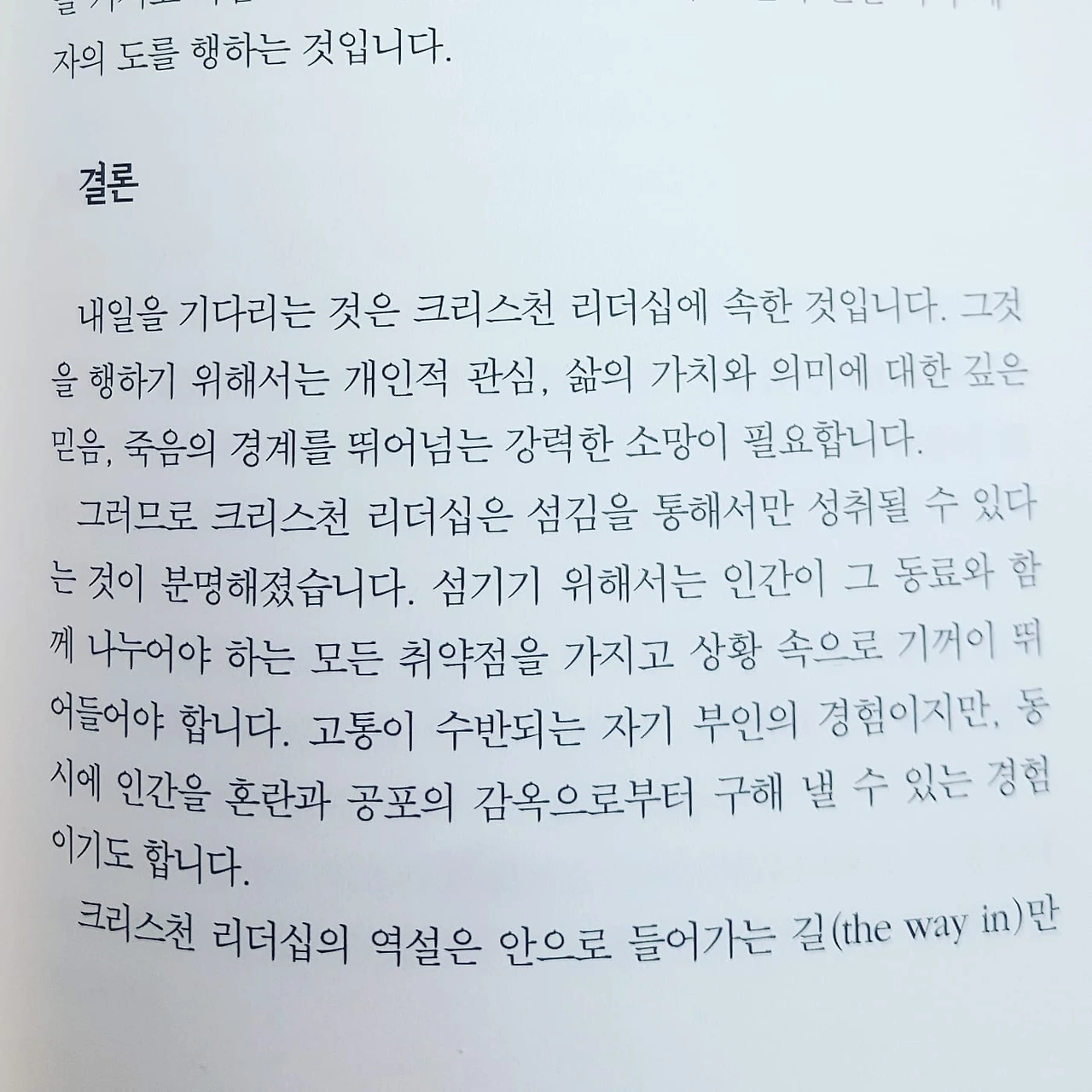 그러므로 크리스천 리더십은 섬김을 통해서만 성취될 수 있다는 것이 분명해졌습니다. 섬기기 위해서는 인간이 그 동료와 함께 나누어야 하는 모든 취약점을 가지고 상황 속으로 기꺼이 뛰어들어야 합니다. 고통이 수반되는 자기 부인의 경험이지만, 동시에 인간을 혼란과 공포의 감옥으로부터 구해 낼 수 있는 경험이기도 합니다.