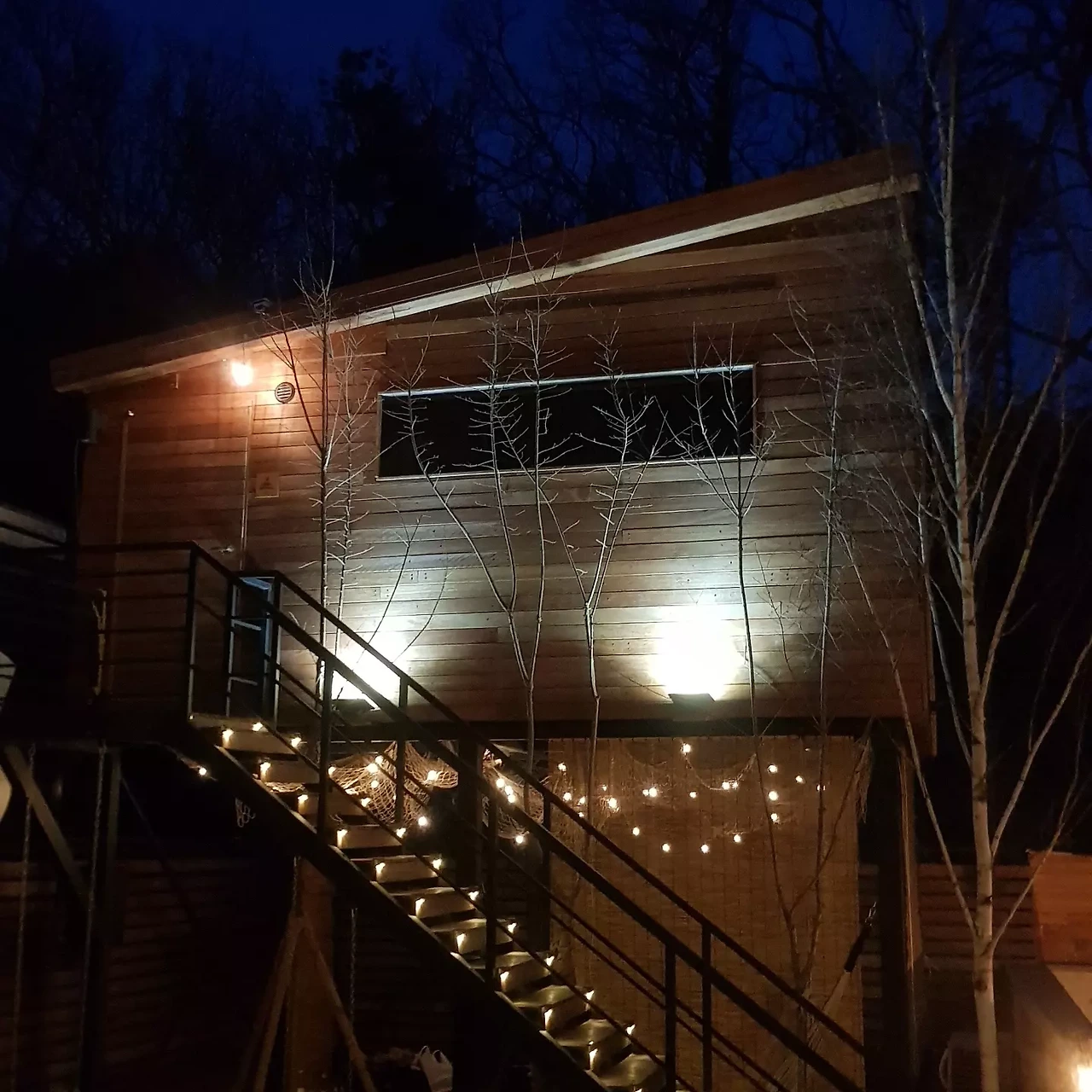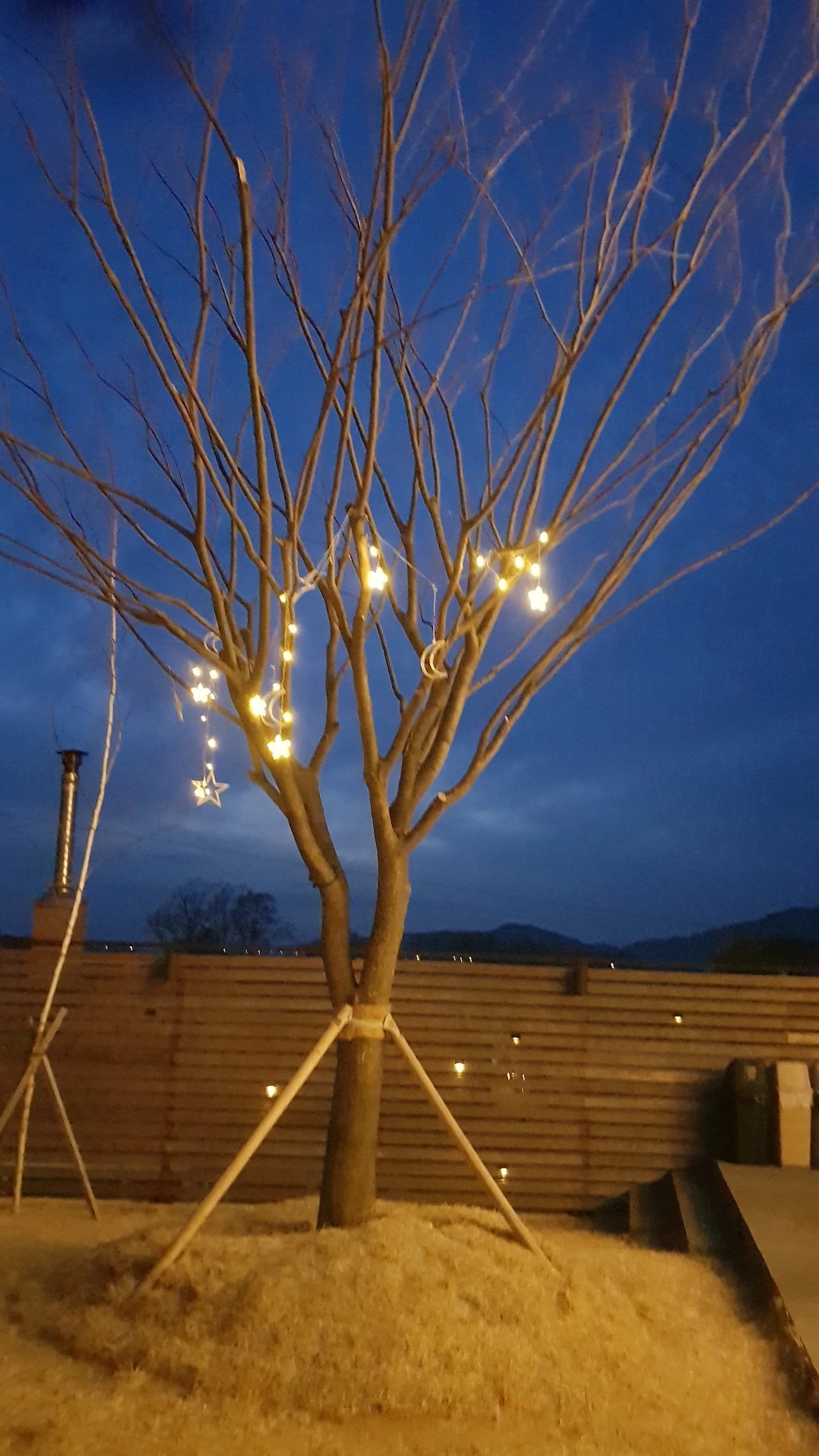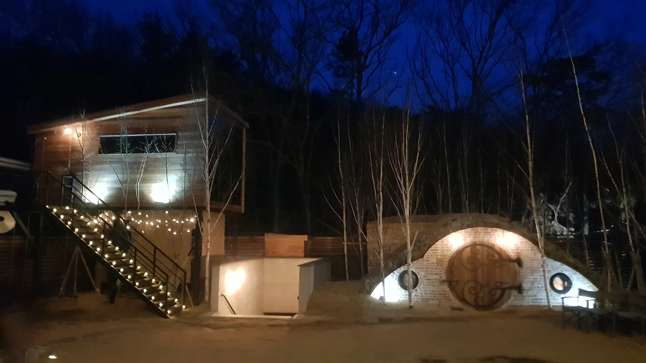 우리가 머문 숙소는 왼쪽 트리하우스이다. 통창으로 멀리 서해를 볼 수 있고 천창으로 하늘을 볼 수 있어서 더욱 매력적이었다. 자연 한가운데에서 책을 보는 느낌이 들게 했다. 둘째가 다음에는 오른쪽 호빗 하우스에 가보자고 했다.