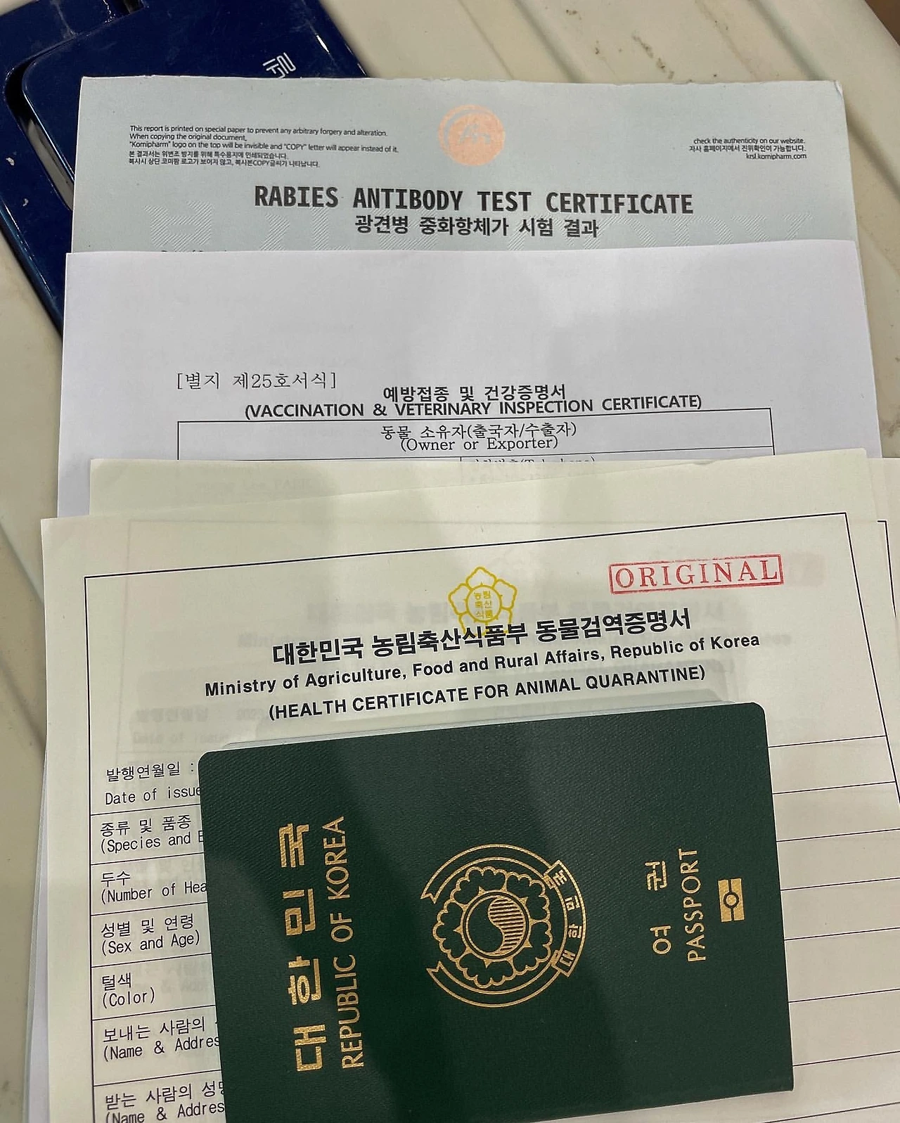 서류 : EU펫여권, EU부속서류, 검역증명서, 예방접종 및 건강증명서 2부, 광견병 항체가 결과지