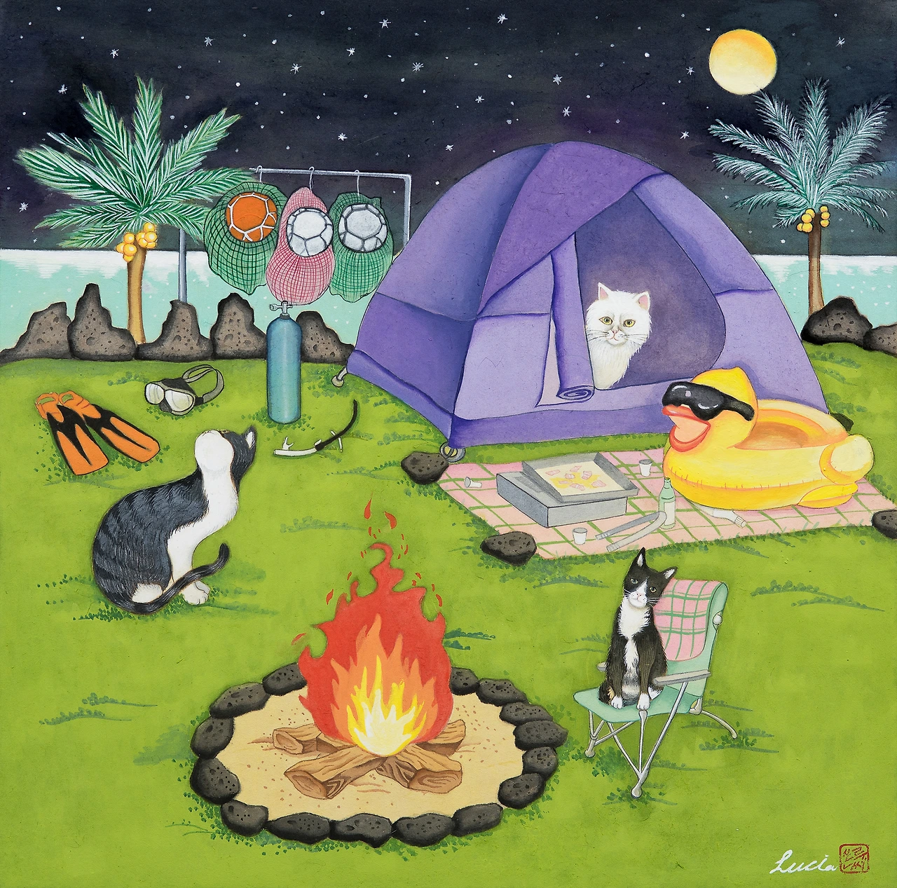 눈부신 네온사인 대신 촘촘한 별이 까만 바다에 내려앉고 현란한 미러볼 대신 노란 달이 하늘에 덩실 떠오르면 제주 캠퍼들의 파티는 시작된다. 마트에서 사 온 도톰한 흑돼지를 굽는다. 익는 동안 맥주 한잔을 들이키면 이미 바다에 들어간 양 온몸이 알싸하고 시원해진다. 친구가 알려준 어묵 구이를 만들기 위해 고기 옆에 어묵도 가만히 올려놓는다. 지글지글 고기가 익으면 고기 한 점을 상추에 싸고 고추장 찍은 구운 어묵과 김치를 넣어 크게 한 쌈 먹는다. 그렇게 육류, 어류, 채소가 한데 어우러진 쌈은 세상이 모두 담긴 맛을 보여준다. 저 멀리서 불꽃놀이가 시작된다. 오늘처럼 제주의 하늘이 붐볐던 날이 또 있을까.