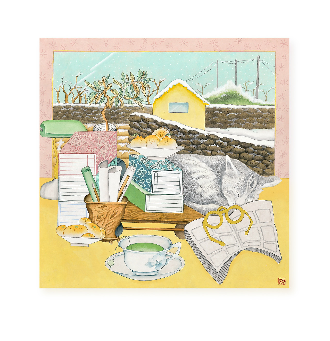 밖은 무척 추운데 이불을 덮고 앉아 따뜻한 차를 마시며 앉아 있으니