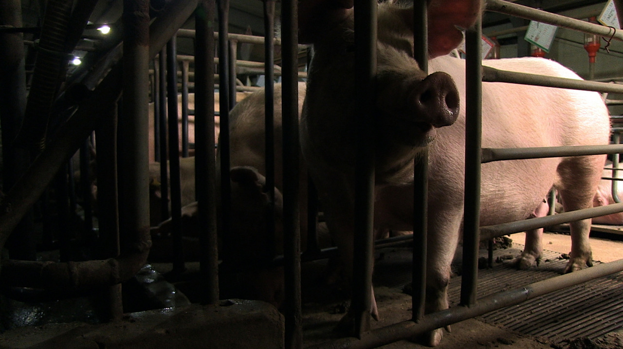 그가 만난 사육 현실은 상상 이상으로 불편한 것이었습니다. 말 그대로 돼지 공장인 그곳은 가축이 크는 공간이 아니라 제품이 생산되는 곳이었습니다. 돼지 공장의 돼지는 1년에 약 2.4회 인공수정을 통해 임신과 출산을 반복합니다. 임신 기간 내내 몸을 겨우 세웠다 앉았다만 할 수 있는 좁디좁은 스톨(stall)에 갇힌 어미돼지는 어미돼지라기 보다는 임신 기계와 다르지 않습니다. 스톨은 유럽과 미국 내 9개 주에서 사용이 금지되었지만 한국에서는 여전히 법적으로 허용되고 있다고 합니다. 그렇게 기계적으로 태어난 자돈은 비육돈(식용돼지)으로 길러지는데, 수컷의 경우 특유의 냄새를 제거하기 위해 마취 없이 거세당합니다. 유전자조작 사료를 먹고 초고속으로 성장한 돼지는 생후 6개월 만에 도축장으로 보내져 생을 마감합니다. 밀폐된 축사, 철제바닥에서 자라는 돼지들은 스트레스로 인해 서로 공격하는데 이때 돼지들이 상하지 않게 하기 위해 꼬리와 이빨을 잘라내는 것이 관행화 되어 있습니다.