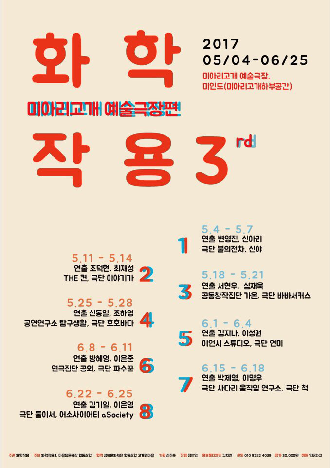 연극은 지난 5월과 6월 두달 동안 진행한 화학작용이라는 프로젝트의 일부다. 벌써 3번째를 맞이한 '화학작용'은 지속적이고 자발적인 창작환경을 원하는 젊은 창작자들의 연극축제다 라고 그들 스스로 정의하고 있다. 연극 창작자들의 연대를 통해 스스로 성장하고 지속적인 창작활동을 이어가게 하는 연극 운동의 결실들이 이처럼 쌓여가니 응원하지 않을 수가 없다. 아, 벌써 다음 화학작용이 기대된다
