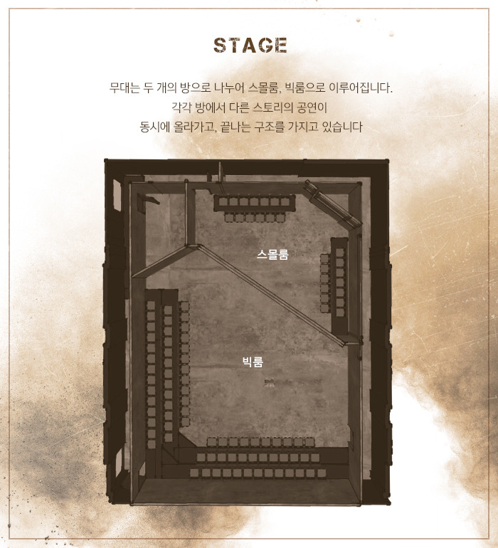 연극은 두 개의 시공간, 1987년 대한민국의 서울과 2017년 시리아의 알레포를 무대로 한다. 각각의 시공간은 다시 두 개의 공간, 빅룸과 스몰룸으로 나뉘고, 관객은 총 4개의 룸 중 하나의 룸을 선택하여 관람할 수 있다. 각각의 룸은 각각의 연극이자 또 연결되어 있는 극으로 관객은 그 모두를 관람해도 되고, 하나의 연극만을 보아도 된다.