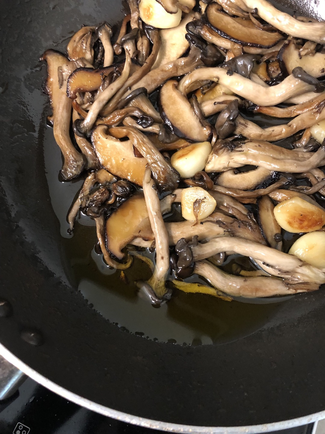 1. 올리브 오일을 넉넉하게 두른 팬에 적당한 크기로 준비된 버섯과 마늘을 넣고 소금 간을 한다. 반드시 약불에서 오래 익힌다.