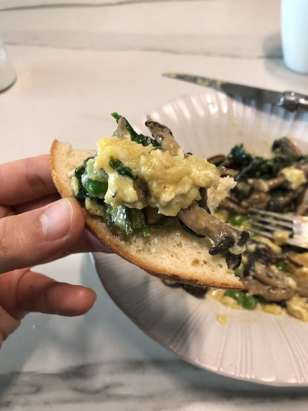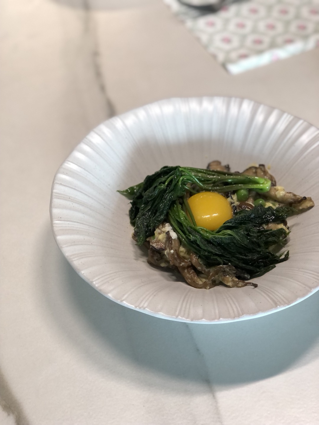 생 노른자에 위화감이 없는 분이라면 접시에 완성된 레부엘토를 담은 후 신선한 노른자를 한 알 추가하는 것을 추천한다. 음식이 가진 온기로 천천히 노른자를 익혀가며 빵을 곁들여 먹는다. 향긋한 올리브오일에 구수한 흙내음을 온전히 내어놓은 버섯은 식감과 감칠맛을 제공하는 것으로 그 역할을 다한다. 완두콩과 제철 엄나무순은 봄의 생동감을 달착지근함과 씁쓸함으로 드러낸다. 그리고 어디에나 잘 어울리는 계란의 융통성이 이 모든 것을 하나로 부드럽게 포용한다. 원리를 알면 레시피나 특정 재료에 집착할 필요가 없다. 계란은 누구와도 잘 어울리면서 상대의 장점을 잘 살려주는, 성격 좋고 다정한데 공부까지 잘하는 친구 같다. 그러니 원하는 향을 가진 식재료가 있다면 용감하게 뭐든 붙여보자.