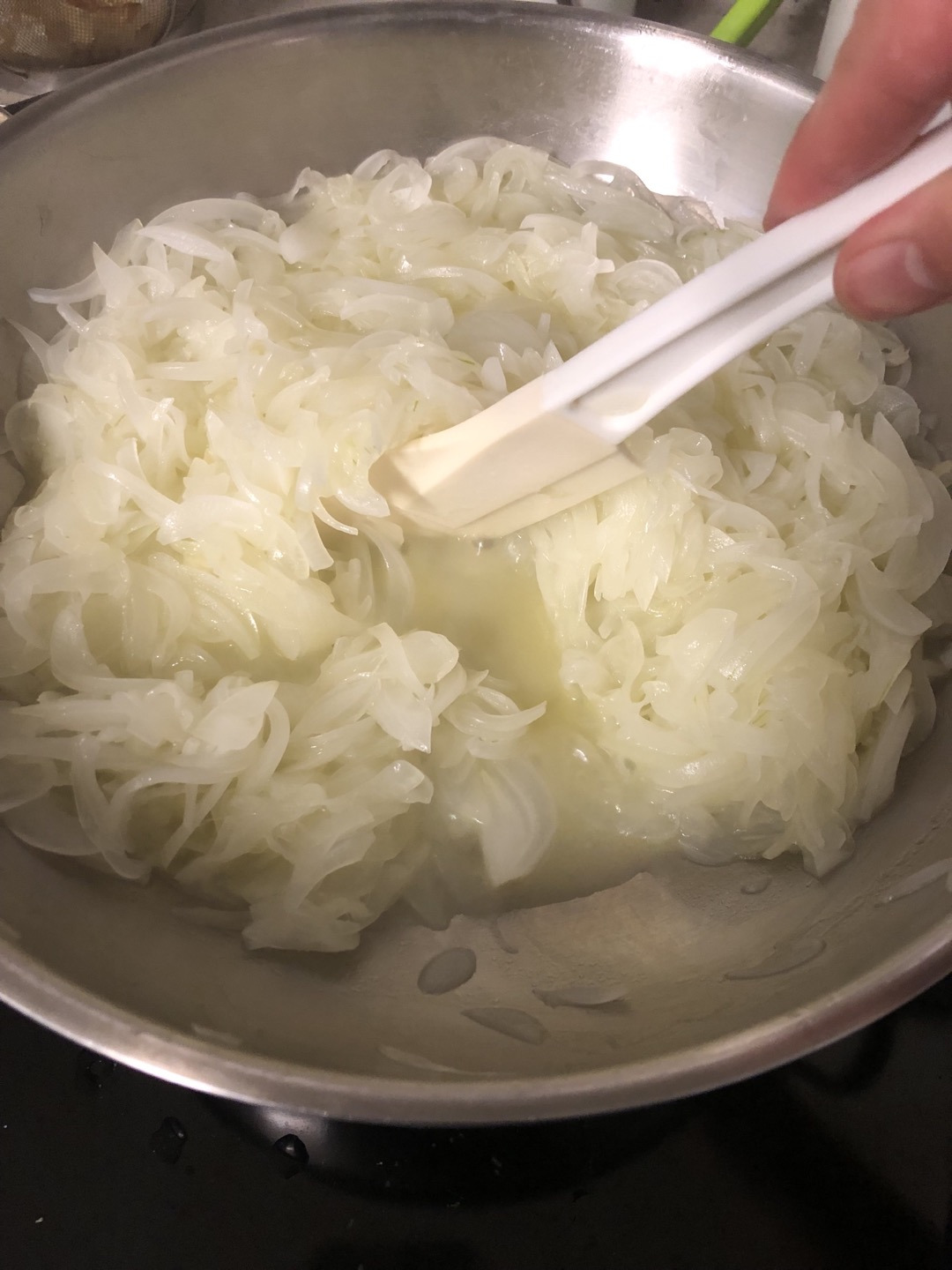 팬이 열을 받아 양파들이 익어가면서 드디어 수분을 뱉어내기 시작한다. 이때 뒤섞지 않으면 바닥의 양파들은 혼자서 열을 받아 이미 색을 내기 시작하고, 윗부분은 생생한 생양파 상태로 남아있게 된다. 열심히 뒤섞자. 한참을 뒤섞으면 양파들이 수분을 방출하면서 흐물흐물해진다. 시간이 조금 더 지나면 대부분의 양파들은 수분을 내어놓고 동시에 바닥에 깔린 그 수분들이 증발하기 시작한다.