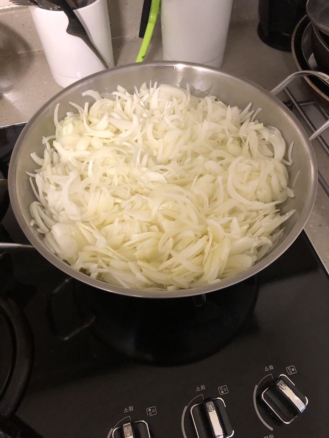 첫 과정은 색을 내기 전에 양파의 수분을 빼는 작업이다. 중불로 시작한다. 오늘 이 배움을 위해 기꺼이 하루종일 불 앞에 서있겠다면 약불도 상관없겠지만, 정말 징글징글하게 오래 걸린다. 그러니 최소한의 불조절은 하는 게 좋다.