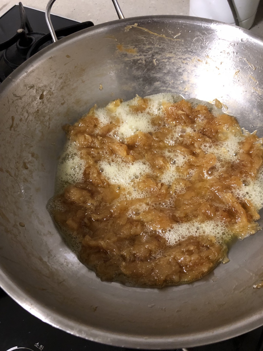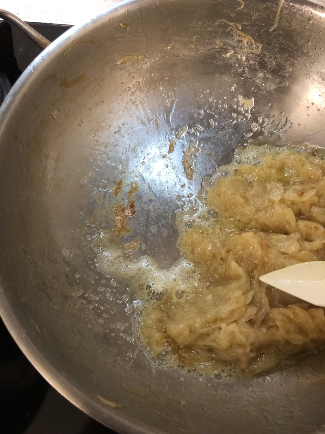 이 과정이 시간이 꽤나 많이 걸린다. 사용하는 양파의 양과 불조절에 따라 다르지만 최소 한 30분에서 50분 정도를 예상한다. 수분이 완전히 빠진 양파는 그 부피가 원래의 1/5 정도로 줄어들게 된다. 이게 정상이다. 수분이 다 날아갔는지는 어떻게 아느냐? 팬에서 나는 증기를 보면 알 수 있다. 전체 과정에서 이 수분을 날리는 과정이 가장 지난한 과정이다. 이 관문을 극복하면 우리는 첫 번째 단계의 양파를 가지게 된다.