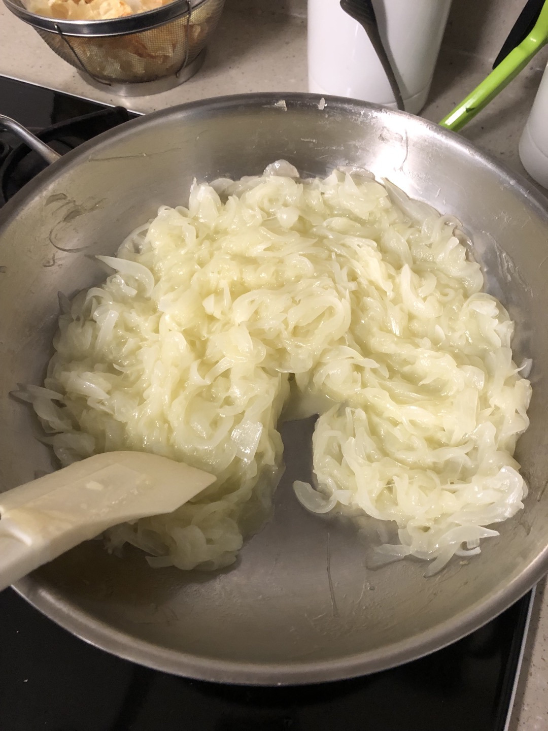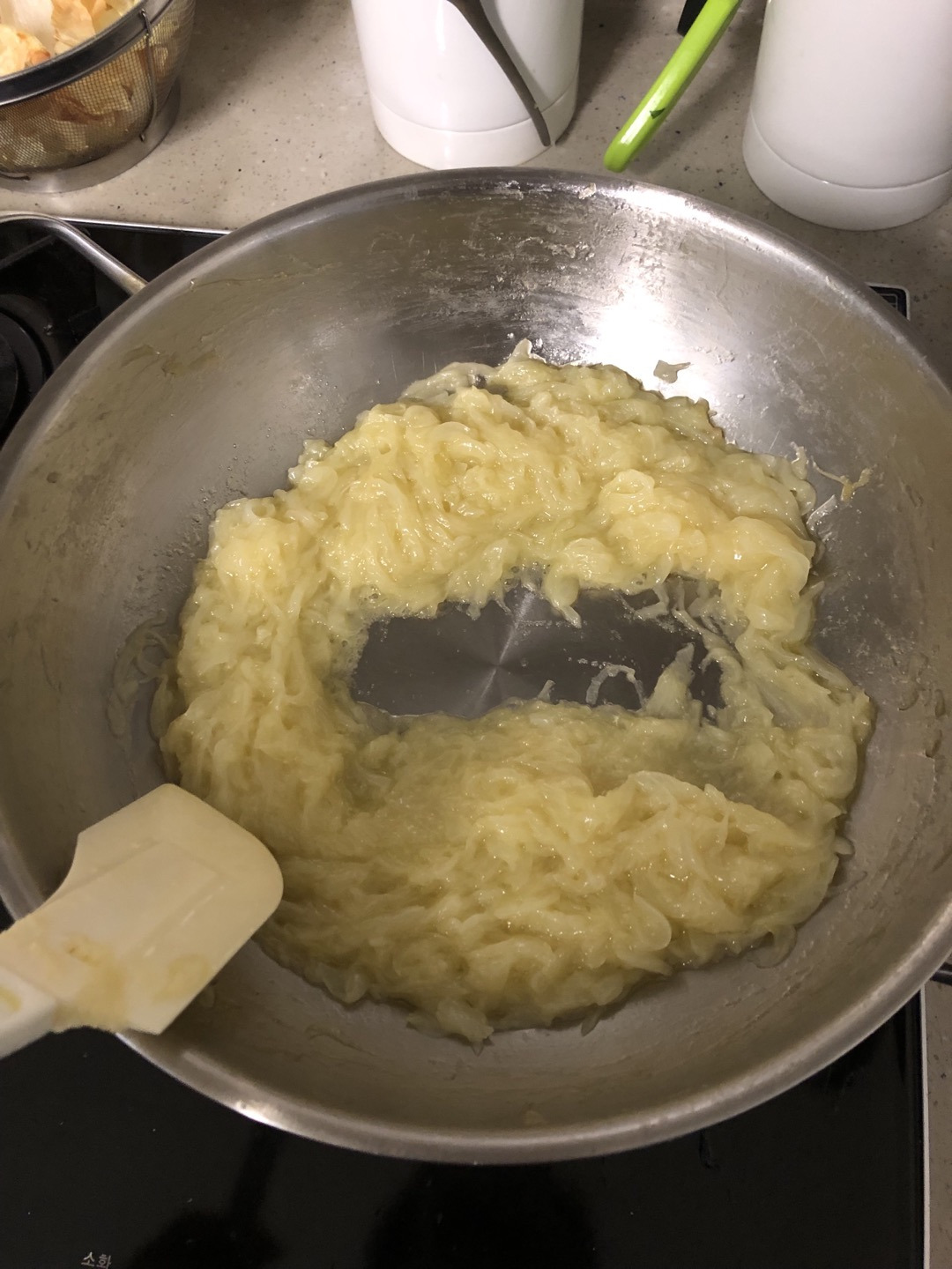 2단계를 넘어서 3단계까지 끌고 가는 것은 이제 가정식의 수준을 넘어 레스토랑의 영역에 가까워진다. 사진을 보시면 양파의 수분이 완전히 증발된 바람에 처음에 넉넉히 넣었던 올리브오일들이 고대로 바닥에 드러난다. 그리고 양파의 형태는 흐물흐물한 상태를 넘어 한 덩어리로 뭉쳐 거의 잼의 형태로 남아있다. 참고로 내가 일했던 레스토랑은 여기서 나아가 한참을 더 익혀 거의 완전히 짙은 고동색에 가까울 정도로 익힌다.
