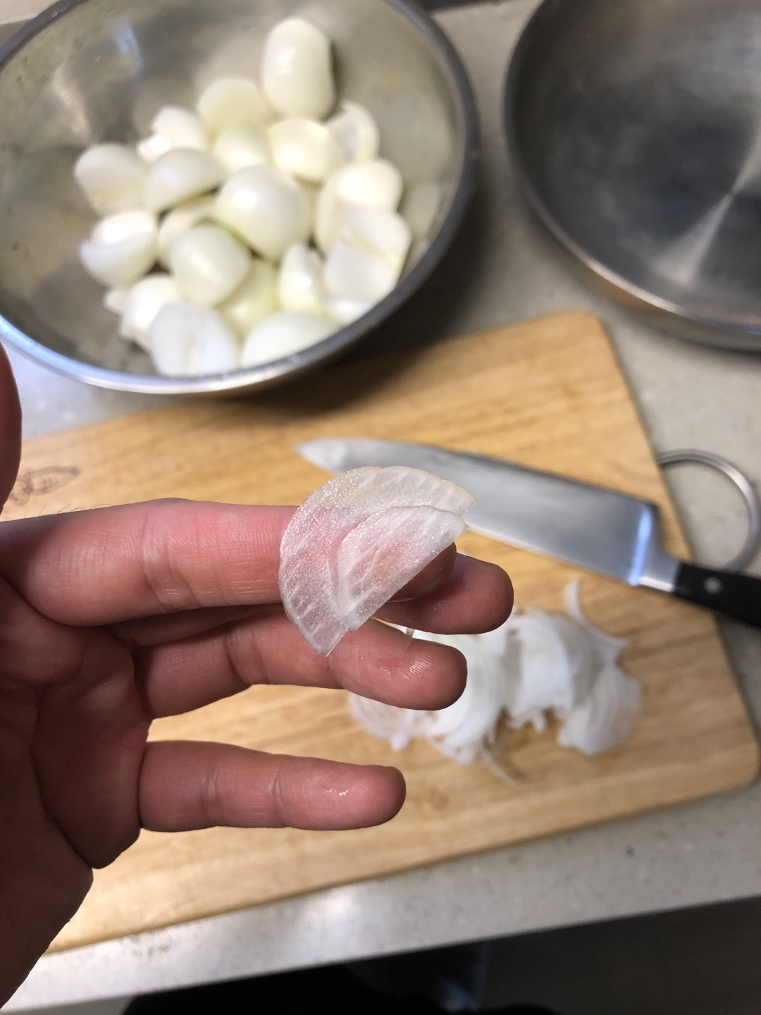 손가락이 살짝 비칠 정도가 좋다. 칼질 연습에 가장 좋은 재료가 양파다. 요리학교 첫 시간에 다짜고짜 양파를 들이미는 이유가 다 있는 것이다. 우리 집 총괄셰프를 꿈꾸며 겸사겸사 칼질 연습을 해보자.