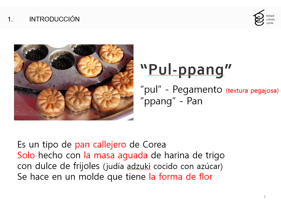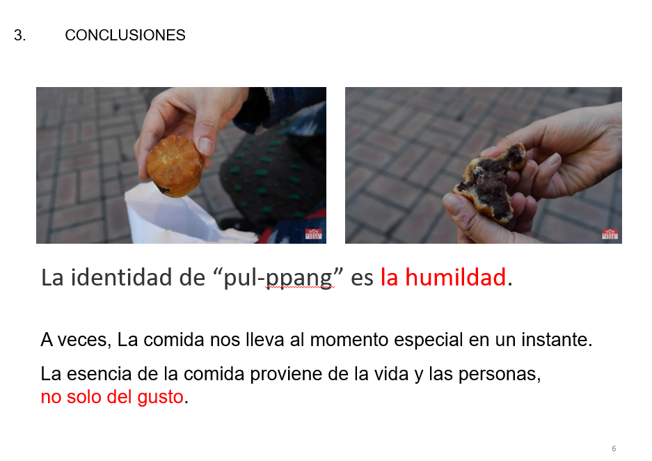 < "이번 과제를 위해 한 가지 한국의 디저트를 골라야 했을 때, 즉시 떠오른 것이 바로 풀빵이었다. 풀빵은 한국의 길거리 음식 중 하나로 국화 모양이 새겨진 틀에 묽은 밀가루 반죽과 팥소 등을 넣어 구운 빵이다. 풀빵은 풀과 빵의 합성어인데, 풀은 'pegamento'를 의미한다. 과거 한국에서는 음식을 만들기 위한 용도 이외에도 접착제의 용도를 위해 묽은 밀가루 반죽을 종종 쓰곤 했다. 그래서 지금도 경우에 따라 묽게 만든 밀가루 반죽을 '풀'이라고 부르기도 한다. 김치에도 발효를 돕기 위해 이 '풀'이 쓰인다.
