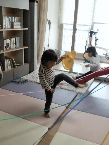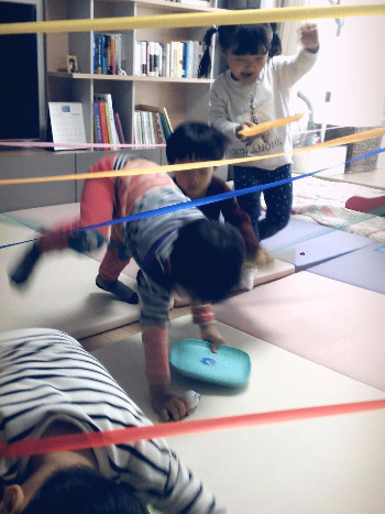 - 집에 있는 의자, 미끄럼틀 등을 활용해 색색 포장끈을 묶기(아이들에게 장애물이 될 수 있도록)