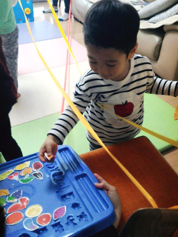 - 색색 끈으로 만들어진 무지개를 넘어 개인별 접시에 과일을 가득 채우는 놀이