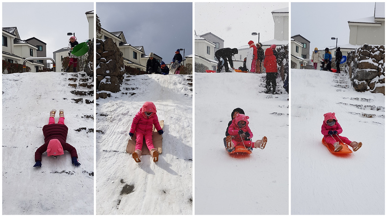 육지보다 기온이 높아 영하로 내려가는 일이 많지 않은데 눈이 내려도 곧장 녹고 말 텐데 왜 그리 호들갑이냐고 할지 모르지만, 이유 없는 호들갑은 아니었다. 2018년 2월, 제주 보름 살기를 하며 폭설을 경험했기 때문이었다. 41년 만에 제주에 폭설이 내렸던 그때, 숙소가 있는 타운하우스에 갇혀 나흘을 지냈다. 30세대가 넘는 타운하우스 단지에는 광장이 있었는데 광장으로 내려가는 계단은 꽤 길었고, 어른들은 합심해 그 계단을 눈 미끄럼틀로 만들었다. 단지 아이들이 우르르 몰려나와 눈썰매를 탔고 하이디도 그 무리에 끼었다. 갇힌 나흘은 눈썰매 덕분에 답답하지 않았다. 비어 가는 냉장고만 걱정할 뿐이었다.