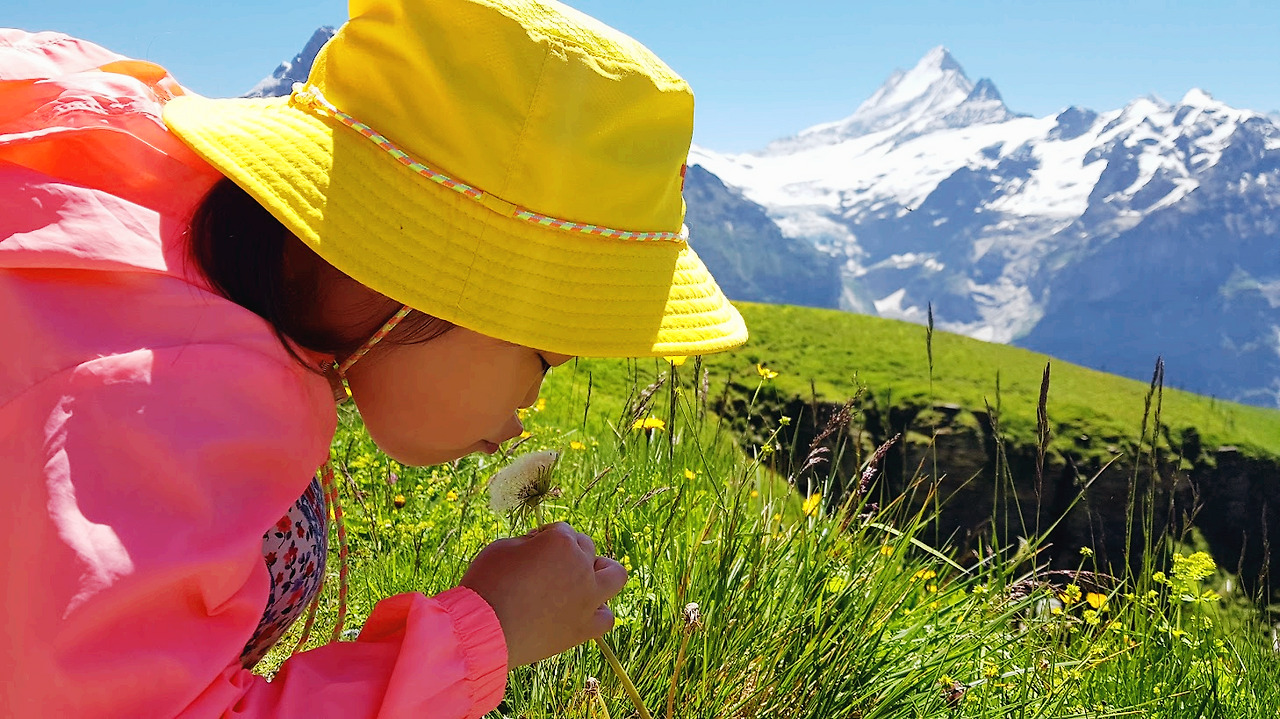 기차에서 바라본 스위스는 스위스 일부일 뿐이었다. 그린델발트에서 내려 곤돌라를 타고 도착한 피르스트에서도 스위스의 아름다움은 계속됐다. 구름 한 점 없이 쨍한 하늘, 싱그러움 그 자체인 풀밭, 파란 하늘과 초록 풀밭을 이어주는 갈색 지붕, 거기에 든든하게 버티고 서 있는 알프스의 설봉들. 여기까지는 기차에서 바라본 풍경과 비슷했지만 피르스트는 한 가지를 더했다. 노란 들꽃이 현실을 동화로 만들었다.