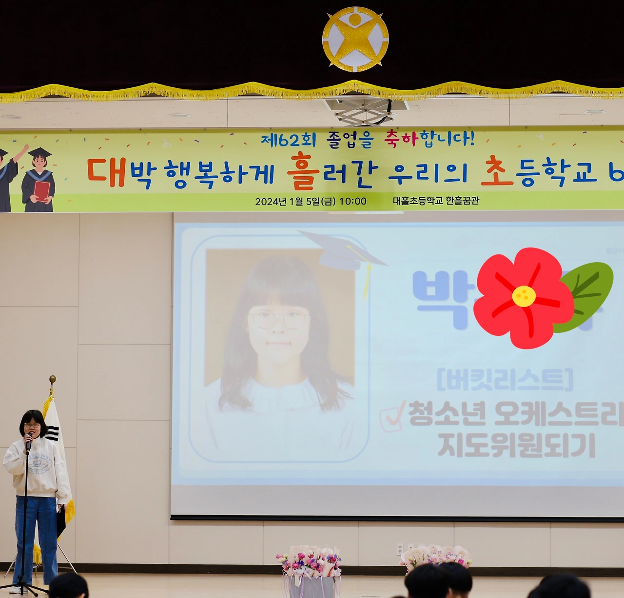 졸업식을 며칠 앞두고 학교 앞에 현수막이 걸렸다. ‘대박 행복하게 흘러간 우리의 초등학교 6년’. 아이들에게 공모를 받아 투표를 통해 선정된 문구라고 했다. ‘대흘초’ 3행시였다. 선생님이 준비하고 아이들이 자리를 채우는 졸업식이 아님은 분명해졌다. 선생님이 제시하는 방향 안에서 아이들이 내용을 채우는 졸업식으로 없던 기대감은 살아나 점점 몸집을 키웠다.