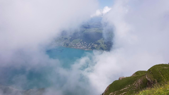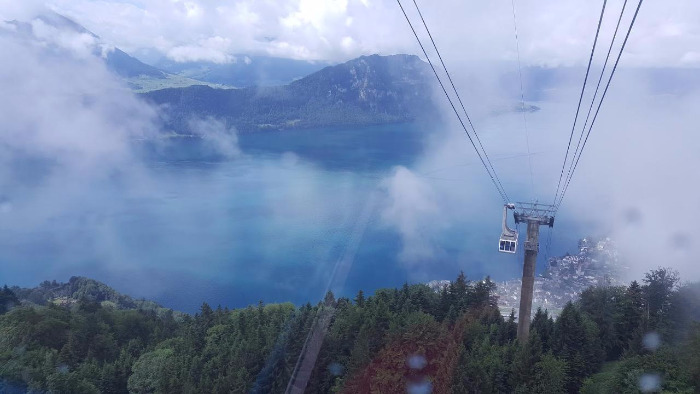 이제 드디어 산들의 여왕이라는 리기산으로 간다. 베기스에서 10여분 케이블카를 타고, 리기 칼트발트로 가서 산악열차를 타고 리기클룸으로 향하는 코스다. 구름은 땅 가까이에서부터 걷혀 점점 더 올라갈수록 짙어졌다. 케이블카를 타자마자 보이는 아래로의 풍경은 환상적이었지만 올라갈수록 구름이 우리를 가둬 아쉬움은 커지고, 한탄이 절로 나왔다. 하지만 아래로부터 날씨가 개고 있으니 그 기운이 점점 더 위로 올라올 것을 기다려보기로 했다. 그리고 언제 이렇게 구름에 갇혀 있어볼까. 구름 한가운데 머무는 것도 신비로운 느낌마저 들어 나쁘지 않았다.