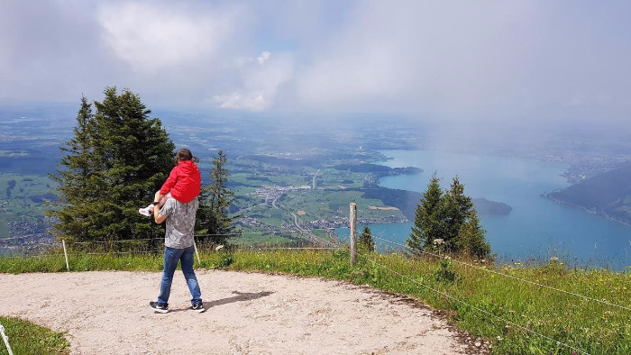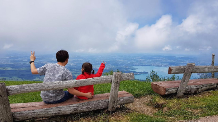 오늘은 '동화 구출작전'이 아닌 '동요 구출작전' 놀이를 하며 아이와 함께 걸었다. 동요를 한 소절씩 번갈아가며 부르는 놀이였다. 이야기를 말이 되게 이어야 하고, 대사를 배역과 줄거리에 맞게 만들어야 하는 '동화 구출작전'보다는 훨씬 쉬운 놀이였다. 하이킹을 더욱 신나게 만드는 재미도 있었고. 예상대로라고 하면 리기산 정상인 리기클룸에서 리기 칼트발트까지는 걸어서 50여분 남짓 소요되는 거리였다. 일곱살 나이를 고려했을 때는 더 늘어날 것이고. 그런데 한 20여분 걸었을까. 아이는 멈춰서는 횟수가 늘었고, 결국 다리가 아프다고 하기 시작했다. 구름이 점점 걷히고 있어 산 저 아래가 잘 보이기 시작했는데 어째야 하나 판단이 서지 않았다. 일단 목마를 태우기로 했다.