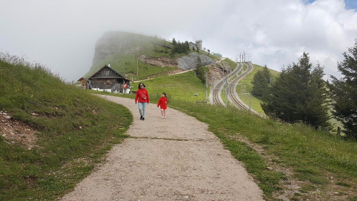 급한 불을 끄고, 아이를 목마에 태워 내려가는 길. 리키 칼트발트 전의 작은 기차역에 산악열차가 다가오는 모습이 보였다. 처음에는 기차 안의 사람들이 우리를 보고 손을 흔들자 따라 흔들기 시작했다. 그러다 내 입에서 나온 말, 그냥 저 기차 타자! 유모차 손님이 기다리는 모습을 보니 지금부터 뛴다면 저들이 기차에 오를 동안 충분히 도착할 수 있을 것 같았다. 잠깐 망설이던 남편도 아이의 묵직한 무게 때문인지 뛰기 시작했다. 그리고 우리는 무사히 기차에 올랐다. 하이킹이 훨씬 더 여유로워요하며 손을 흔들다 허겁지겁 기차에 올라탄 우리의 모습이 우습기는 했지만 고생보다는 나을터였다.