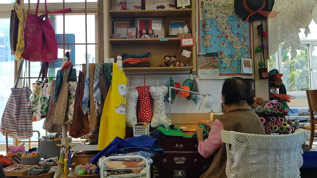 비양도로 간다는 우리에게 섬을 구경하는 법을 귀띔해주신 할머니는 재봉틀 앞에 앉으신다. 다시 한번 놀랄 차례. 가게 곳곳에 걸린 수제품들이 할머니 솜씨란다. 요즘 유행하는 스트라이프부터 고운 꽃무늬까지 벽면 가득 걸린 세련되면서도 예쁜 에코백을 보며 사고 싶은 마음을 간신히 참았다. 여든이 넘은 할머니는 카페를 운영할 수 없다는 편견, 제주도 시골 할머니는 촌스러울 것이라는 편견을 모두 물리치는 제주 할머니셨다.