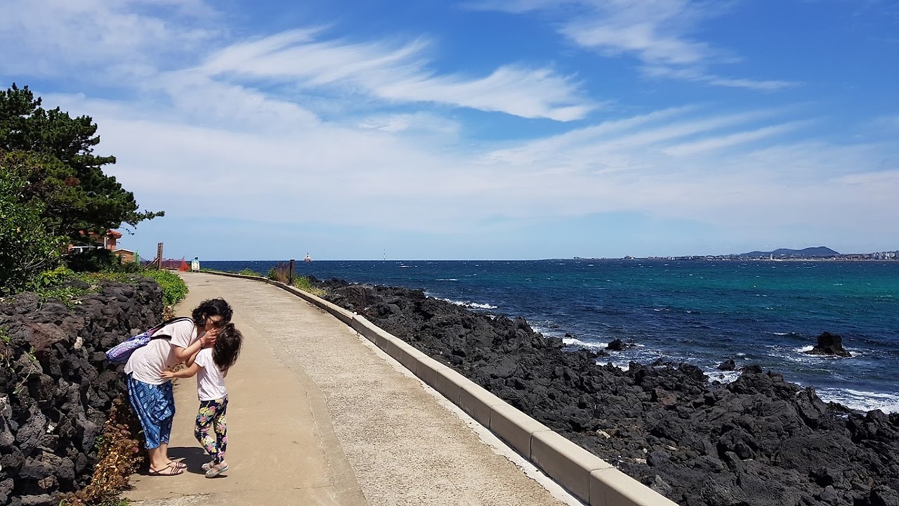 바람은 거셌지만 바람 속을 걷는 우리의 시간은 느렸기에 잊고 있던 방송 원고의 한 페이지를 떠올릴 수 있었다. 고요한 섬 둘레길에서 생각은 깊어졌다. 제주를 바다 건너 조금 떨어져 바라보는 시선도 생각을 변주했다. 게다가 놀이터 찾기 탐험에 열중하며 평일에 보지 못했던 아빠 옆에 껌딱지처럼 딱 달라붙어 딸도 엄마의 사색을 도왔다.