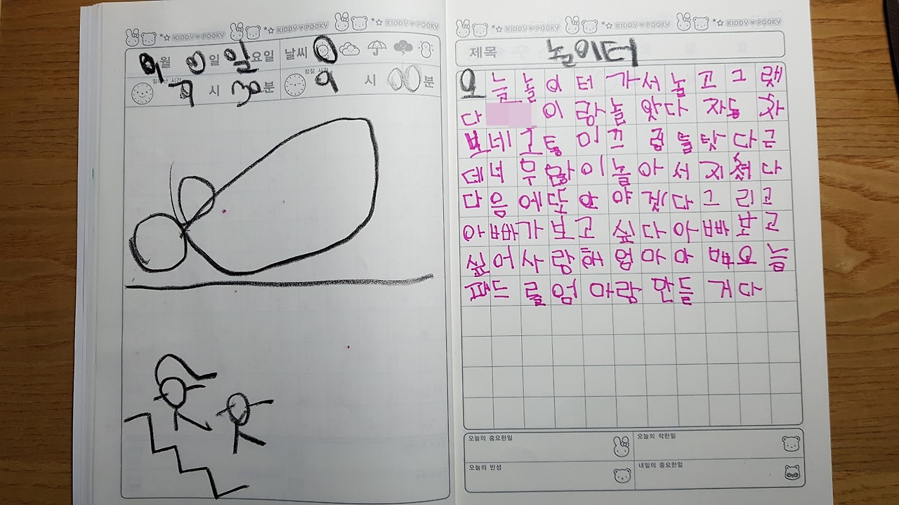 일기설명: 오늘 놀이터 가서 놀고 그랬다. **이랑 놀았다. 자동차 보내고 통 미끄럼틀 탔다. 근데 너무 많이 놀아서 지쳤다. 다음에 또 와야겠다. 그리고 아빠가 보고 싶다. 아빠 보고 싶어. 사랑해, 엄마 아빠. 오늘 패드를 엄마랑 만들 거다.