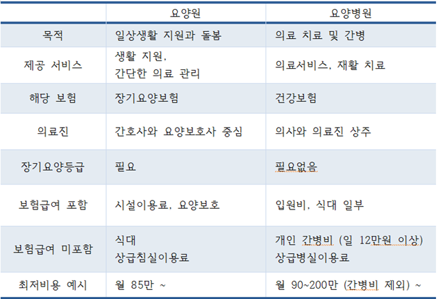 요양원과 요양병원을 혼동하는 경우가 생각보다 많습니다. 그렇지만 직접 방문하고 제공되는 서비스를 살펴보면 차이가 큰 것을 알 수 있습니다. 간단히 말하면 요양원은 보살핌이 목적인 주거시설이고 요양병원은 치료시설입니다.