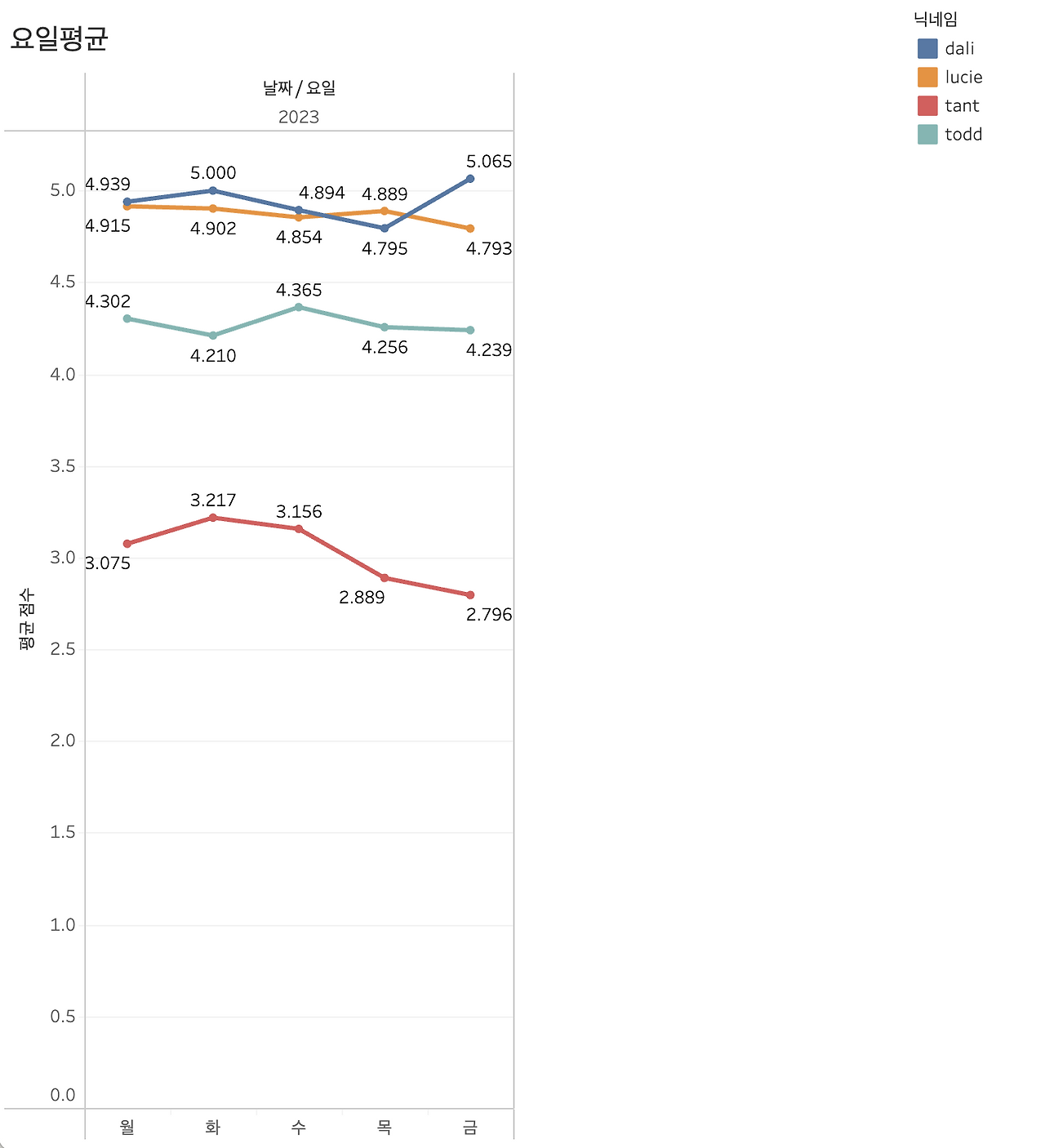 일자별 꺾은선 차트만 보면 단조로우니까, 같은 데이터로 최대한 여러 가지를 볼 수 있도록 데이터 테이블 만들 때부터 요일 정보를 넣어 요일별 트렌드를 볼 수 있게 만들어 두었다. 요일별 차트를 보니 예상외로 금요일에 컨디션이 높아지는 추이를 보이는 사람이 달리 하나뿐이었다. 달리를 빼고는 모두 경영진이라서, 경영진은 금요일에 좋을 일이 없는 거냐며 다 같이 빵 터졌다. 나도 금요일에 더 좋은 컨디션일 줄 알았는데 되려 다른 요일보다 약간 떨어지는 걸 보고 놀랐다. 특히나 탄트는 금요일이 되면 컨디션이 쭉 빠지는 걸 볼 수 있어서 한바탕 웃었다. 여러분 대표가 이렇게 힘든 것입니다..!