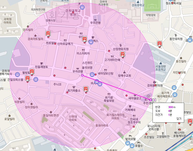 편의점 주인들은 인건비가 오르게 되면 더 이상 버틸 수가 없다고 이야기합니다. 프랜차이즈 본부에 수수료를 납부하고, 건물 임대료로 내야하는데 거기에 아르바이트 월급까지 올려주면 남는 것이 없다는 것입니다. 그래서 살펴보았습니다. 다음 지도를 활용하여, 제가 생활하는 서울특별시 동대문구 회기로 경희대학교 앞 삼거리부터 반경 300미터 내의 편의점 수를 세어보았습니다. 사진에서 빨간 점으로 표시된 곳이 모두 편의점입니다. 300미터 안에는 총 15개의 편의점이 있었고, 인근의 회기역까지로 범위를 넓히면 20-30개의 편의점이 위치하고 있는 것을 확인할 수 있었습니다.