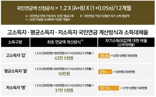 이들이 받게 될 연금은 고소득자는 월 62만5천원으로 이는 본인 소득 값(B값) 대비 20.8%에 해당된다. 즉, 20.8%가 고소득자의 소득대체율이 되게 된다. 평균소득자의 월 평균 연금액은 50만원 (25%), 저소득자의 월 평균 연금액은 37만 5천원으로 소득대체율은 37.5%로 볼 수 있다.