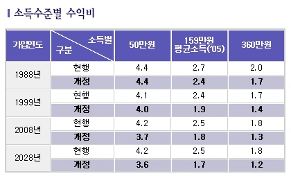 수익비는 1을 기준으로 보는데, 수익비가 1이라는 것은 내가 낸 보험료의 총액과 받게 되는 연금액의 총액이 같다는 것을 의미한다. 위의 표를 보면, 연금의 개정 전 후로 그 수익비가 다소 차이는 있지만, 모든 소득 계층은 수익비가 1을 넘는 다는 것을 알 수 있다. 이 말은 모든 계층에서 본인이 낸 보험료보다 더 많은 연금을 받는 것을 의미한다.
