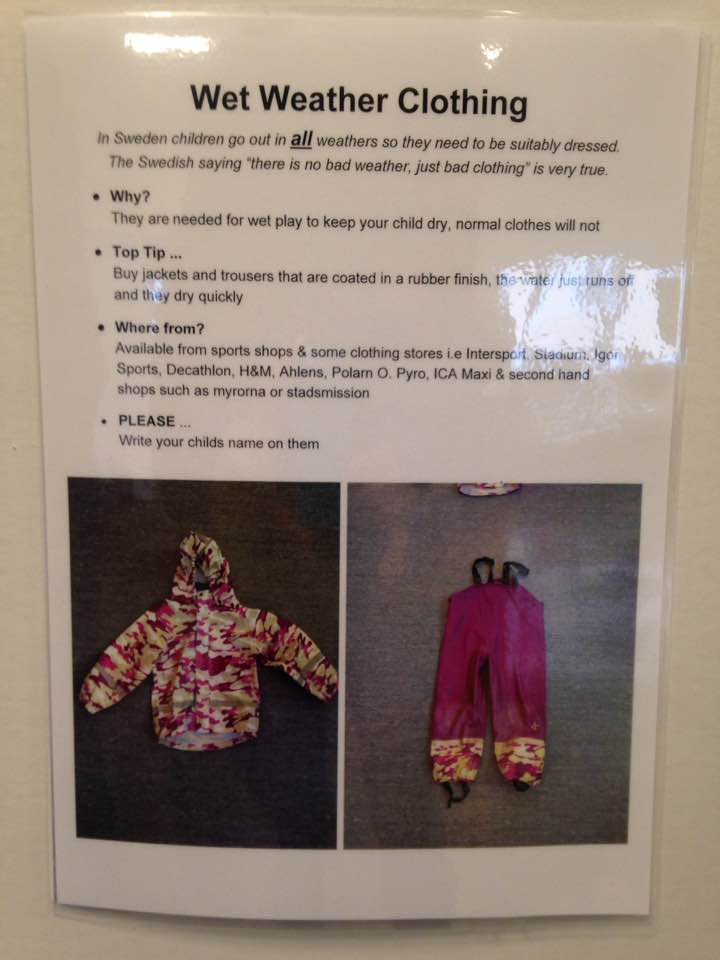 스웨덴은 유치원에 다니는 아주 어린 아이들부터 초등학생까지 체육시간 외 혹은 점심 먹고 자유시간 말고도 하루에 일정시간은 무조건 야외 활동을 해야 한다. 이것은 비가 오든 눈이 오든 바람이 불든 날씨가 어떻든 상관이 없다. 비나 눈이 오면 비옷을 입고 나가서 놀면 된다. 바람이 불면 그래도 비옷을 입고 나가서 놀면 된다. 아무리 추워도 아장아장 걷는 아이들이건 큰 아이들이건 옷만 든든히 입고 나가서 놀면 그만이다.