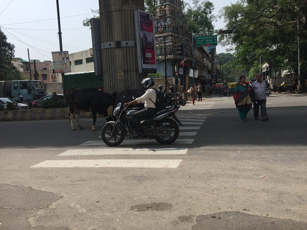 화면 오른쪽 밖에는 두 마리의 소를 피해 가려고 수많은 차와 오토바이가 병목 현상을 빚고 있었습니다.