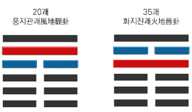 앞에서 봤듯이 화지진괘는 20괘 풍지관괘의 육사와 구오가 자리를 바꾸어 만들어진 괘입니다. 그 자리바꿈을 <단전>에서 '유진이상행柔進而上行'이라고 했습니다.